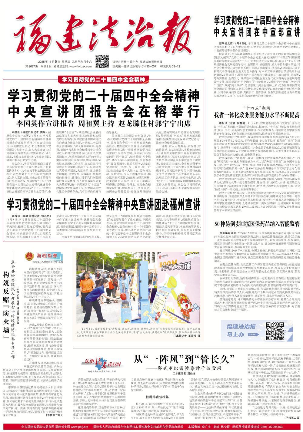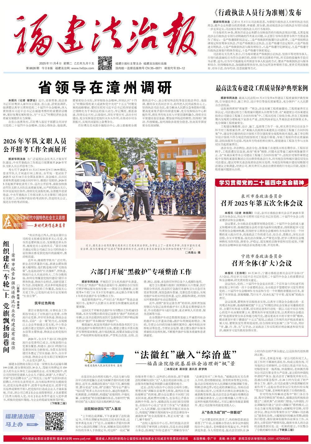 11月4日,漳州市委常委、政法委书记张慧德带队赴华安县,深入正兴学校、明劲家居公司、未成年人保护法治宣传(华安)基地、仙都镇送坑村等,宣讲党的二十届四中全会精神并开展调研,听取基层一线谋划推进“十五五”时期政法工作意见建议,并就贯彻全会精神,统筹发展和安全,以政法工作现代化服务保障高质量发展提出指导意见。[详细]