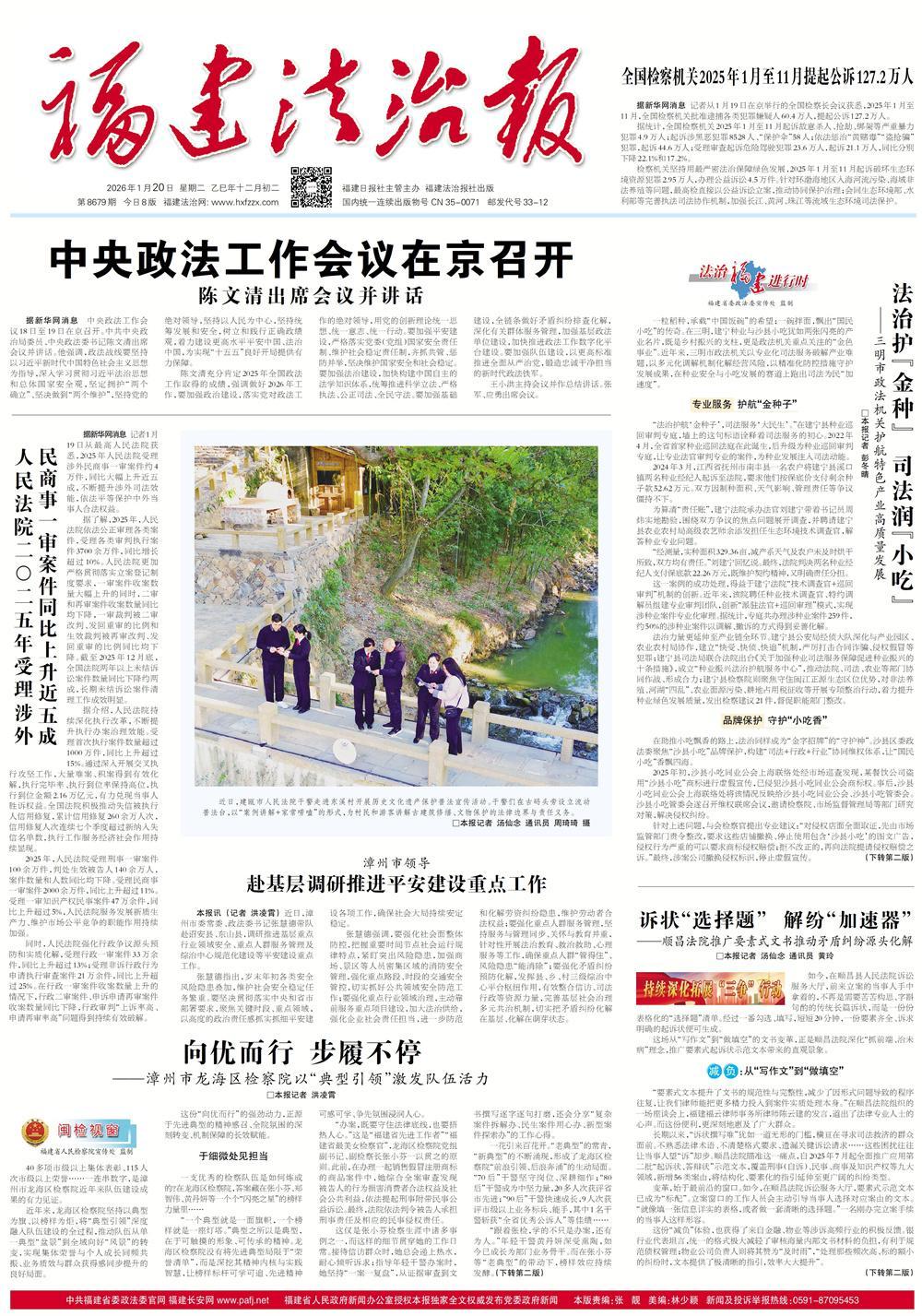 中央政法工作会议18日至19日在京召开。中共中央政治局委员、中央政法委书记陈文清出席会议并讲话。他强调,政法战线要坚持以习近平新时代中国特色社会主义思想为指导,深入学习贯彻习近平法治思想和总体国家安全观,坚定拥护“两个确立”、坚决做到“两个维护”,坚持党的绝对领导,坚持以人民为中心,坚持统筹发展和安全,树立和践行正确政绩观,着力建设更高水平平安中国、法治中国,为实现“十五五”良好开局提供有力保障。[详细]
