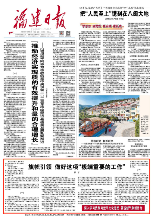 党的工作很多。宣传思想文化工作被定位为“是一项极端重要的工作”。 何以“极端重要”? 文化是一个国家、一个民族的灵魂。文化自信是更基础、更广泛、更深厚的自信,是一个国家、一个民族发展中最基本、最深沉、最持久的力量。 金秋十月,习近平总书记再次对宣传思想文化工作作出重要指示,用“三个事关”告诉我们“文化关乎国本、国运”:宣传思想文化工作事关党的前途命运,事关国家长治久安,事关民族凝聚力和向心力。 以习近平同志为核心的党中央举旗定向,领航这一“极端重要的工作”,丰富和发展了马克思主义文化理论,构成了习近平新时代中国特色社会主义思想文化篇,形成了习近平文化思想。 一 思想之光,必有其源。 1989年5月,时任宁德地委书记的习近平同志主持召开宁德地区新闻工作会议,作了《把握好新闻工作的基点》的讲话。他开宗明义、旗帜鲜明地提出,“当前要进一步加强党对新闻工作的领导”。 习近平从“冷静分析思考 认清当前形势”“搞好舆论引导 弘扬社会正气”“加强新闻队伍建设”三个方面阐述新闻工作及新闻工作者如何把握好工作基点问题:突出强调新闻工作的党性、高度重视新闻工作、切实加强对新闻工作的领导,同时对新闻队伍的建设提出了殷切期望。 这次讲话,经新华社记者整理后,发表在1989年第6期《中国记者》上。据目前资料,这是习近平关于新闻舆论相关论述最早公开发表的文章,具有重要理论价值和实践指南意义。 高度重视宣传思想工作,充分发挥宣传思想工作的重要作用,是我们党的传统和优势。 在《把握好新闻工作的基点》一文中,习近平指出,“要看到新闻事业是党和人民的喉舌,担负着反映舆论、引导舆论的一个重要任务。”“我们强调的党性,包含着人民性的深刻内涵。” “我们党历来有一个传统,就是通过运用报纸、广播、电视等宣传工具,宣传党的路线、方针、政策,教育人民,反映人民的呼声……”1989年11月1日,在习近平关心推动下,停刊20年的《闽东报》正式复刊。 习近平参加了当年《闽东报》复刊大会,并撰写了热情洋溢的复刊词《坚定方向 弘扬正气 振兴闽东——为〈闽东报〉复刊而作》。宁德地委对宣传思想工作的领导进一步加强,宁德地区宣传党的路线、方针、政策的主阵地进一步建设。 加强党对宣传思想工作的全面领导,牢牢掌握党对意识形态工作的领导权。 习近平在福建工作了17年半。从沿海到山区,从市里到省里,他都对宣传思想工作给予高度重视。在福州市委书记任上,他多次出席全市宣传部长会议、宣传工作会议、新闻记者月谈会。福州市委把宣传思想工作列入党委的重要议事日程,及时提出各个时期宣传思想工作的指导思想、工作方针和工作重点,定期分析宣传思想工作和意识形态领域带有根本性、方向性的问题。 …… 思想伟力激荡山海,真理之光照亮征途。 2013年8月19日,习近平总书记出席全国宣传思想工作会议,指出,“做好宣传思想工作必须全党动手。”“各级党委要负起政治责任和领导责任,加强对宣传思想领域重大问题的分析研判和重大战略性任务的统筹,不断提高领导宣传思想工作能力和水平。” 党的十八大以来,习近平总书记先后两次出席全国宣传思想工作会议并讲话,就文艺工作、哲学社会科学工作、高校思想政治工作、文化传承发展等主持召开会议并发表一系列重要讲话,以坚定的文化自觉、宏阔的历史视野、深邃的战略考量,提出了一系列新思想新观点新论断。 二 为国家立心,为民族立魂。 “没有中华五千年文明,哪有我们今天的成功道路。”2021年仲春,习近平总书记考察福建,第一站就来到世界文化和自然遗产地武夷山。习近平总书记强调,要推动中华优秀传统文化创造性转化、创新性发展,以时代精神激活中华优秀传统文化的生命力。 民族自觉,是社稷自觉;文化自信,是江山自信。 围绕“举旗帜、聚民心、育新人、兴文化、展形象”建设社会主义文化强国,要保持对文化理想、文化价值的高度信心,保持对文化生命力、创造力的高度信心,牢记文化使命,坚持守正创新,在实践创造中进行文化创造,在历史进步中实现文化进步,使中国特色社会主义文化始终反映时代精神、引领时代潮流。 在当年经济落后的闽东,习近平亲自与省音协的专家拟定一个方案,指导闽东文艺工作者拍一部风光音乐电视片,奏响了《山海的交响》。明确的目标是“通过文化建设,弘扬民族文化传统,不仅增强闽东人民的自信心,而且提高外界对闽东的信心”。 在福州,面对百业待兴、经济尚不宽裕的现状,习近平亲自协调推动,将挂靠在省艺术学校的福州闽剧班综合大楼建设列入1992年福州市为民兴办20件实事之一;一锤定音,接手举办第三届中国戏剧节暨第十届中国戏剧“梅花奖”颁奖活动,这是该活动首次由地方承办。 面对经济发展、城市开发建设与文化遗产的冲突,从一个个“拆”字中保护三坊七巷,从炸药包下抢救“南方周口店”——万寿岩。习近平指出,“发展经济是领导者的重要责任,保护好古建筑,保护好传统街区,保护好文物,保护好名城,同样也是领导者的重要责任,二者同等重要。”“保护好古建筑、保护好文物就是保存历史,保存城市的文脉,保存历史文化名城无形的优良传统。” 岁月不居,时节如流。在保护与传承中凝聚强大的
