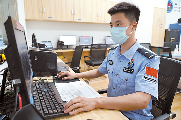 刘隆森进行出入境数据核查工作 这个被表扬“成熟”的小伙子其实是1998年出生,但已有8年的工作经历。8年间,他实现了从社会青年到武警战士再到人民警察的华丽转身,接受了新冠肺炎疫情的洗礼,经历了边境地区实践锻炼的磨砺。
