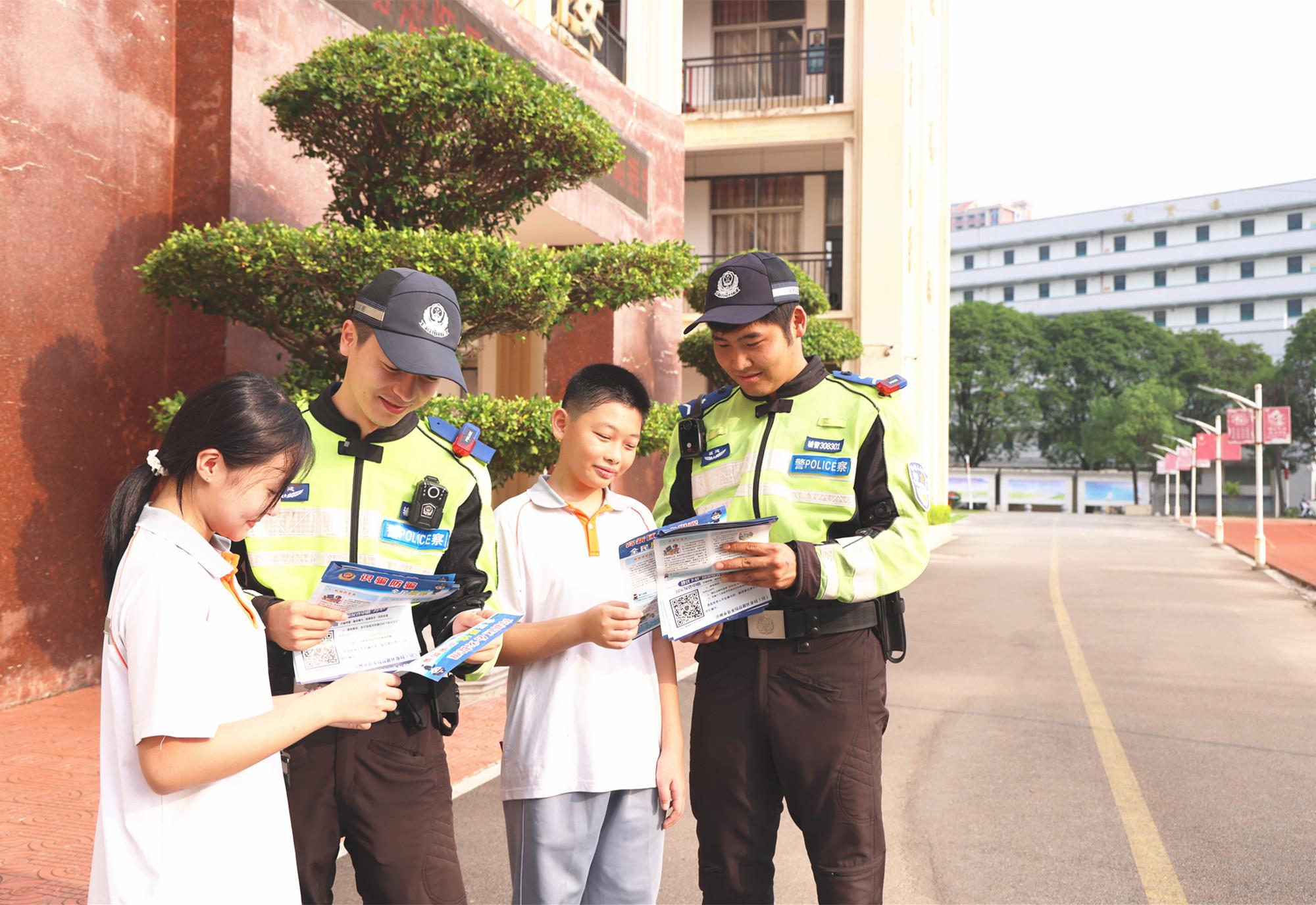 近日,漳州市公安局高新区分局民警深入辖区校园,开展法治宣传活动。活动中,民警聚焦禁毒、反诈、防校园暴力及交通安全等主题,通过案例分析、情景模拟等生动形式,向学生们普及法律知识。图为民警向学生发放宣传材料。 |