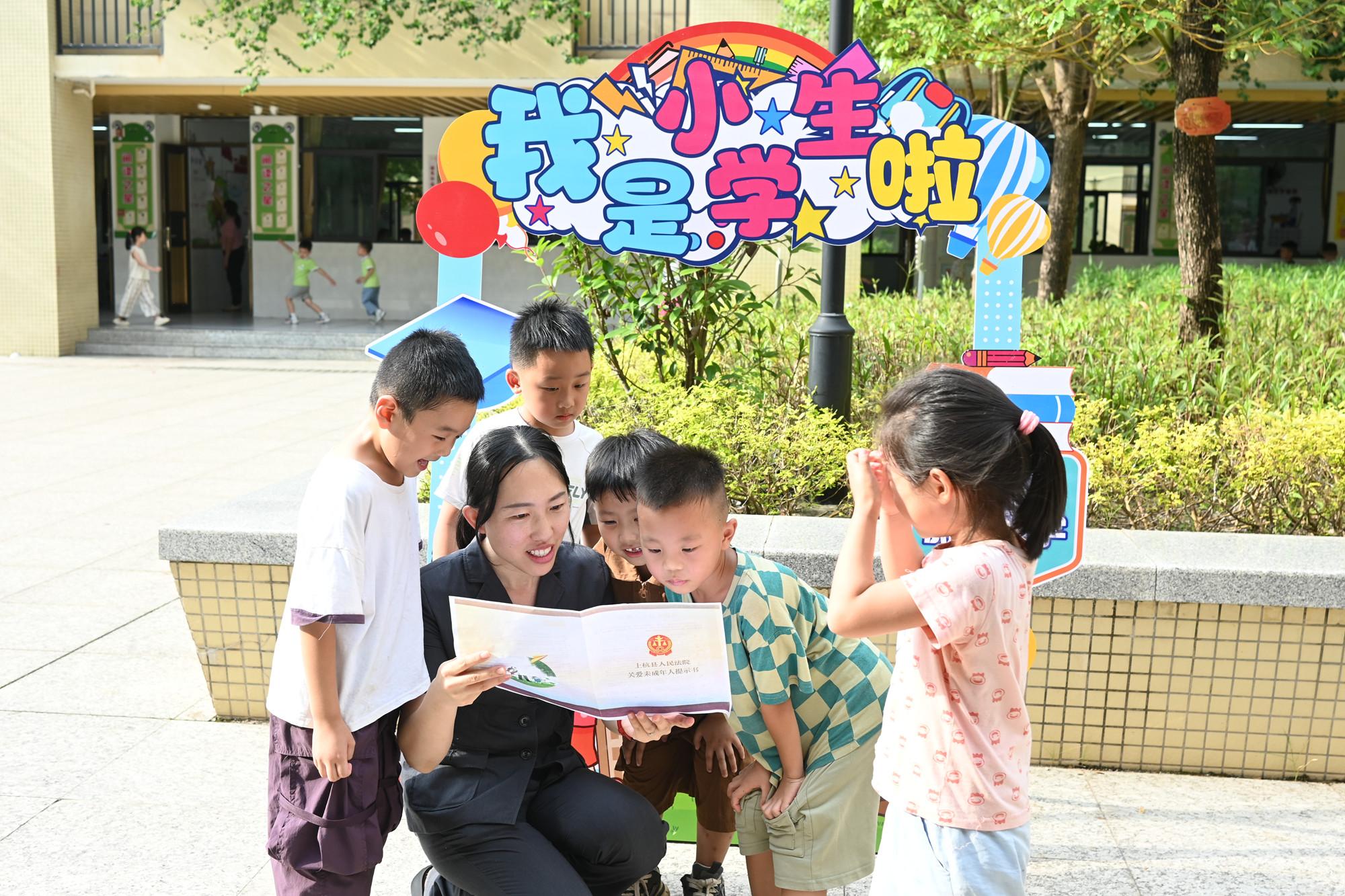 近日,上杭县人民法院法官走进紫金小学,以寓教于乐的方式教授学生法律小知识,提升学生的自我保护能力。图为法官向学生讲解《关爱未成年人提示书》。 |