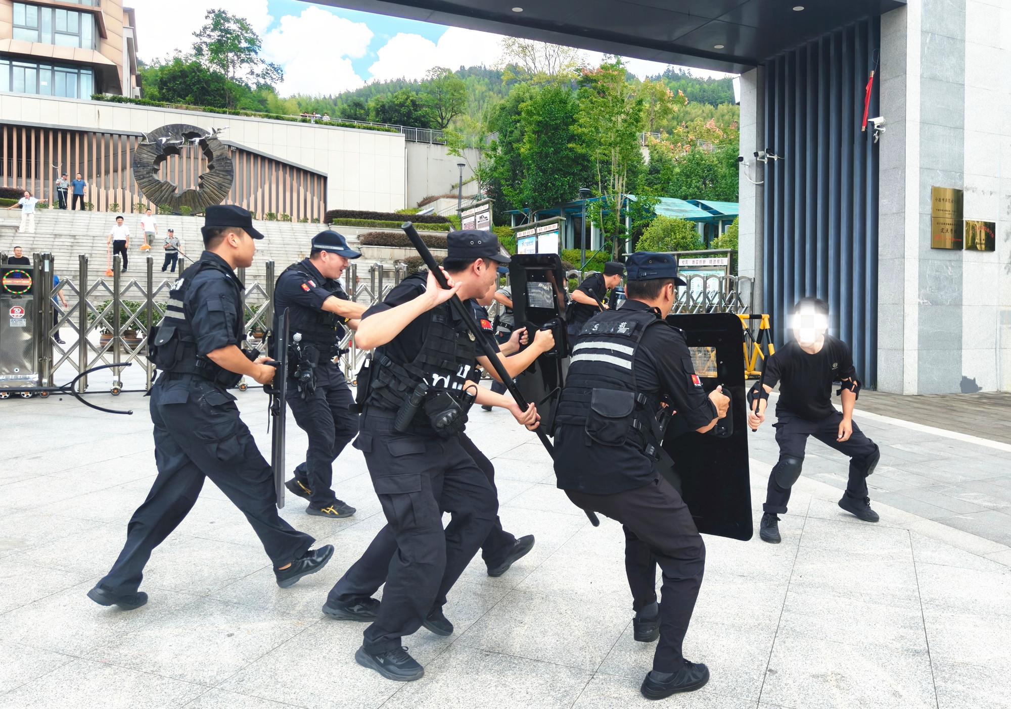 近日,寿宁县公安局巡特警反恐大队组织民警辅警走进寿宁县第六中学,为学校安保人员及教职工进行反恐防暴技能培训,并开展模拟处置演练。图为演练现场。 |