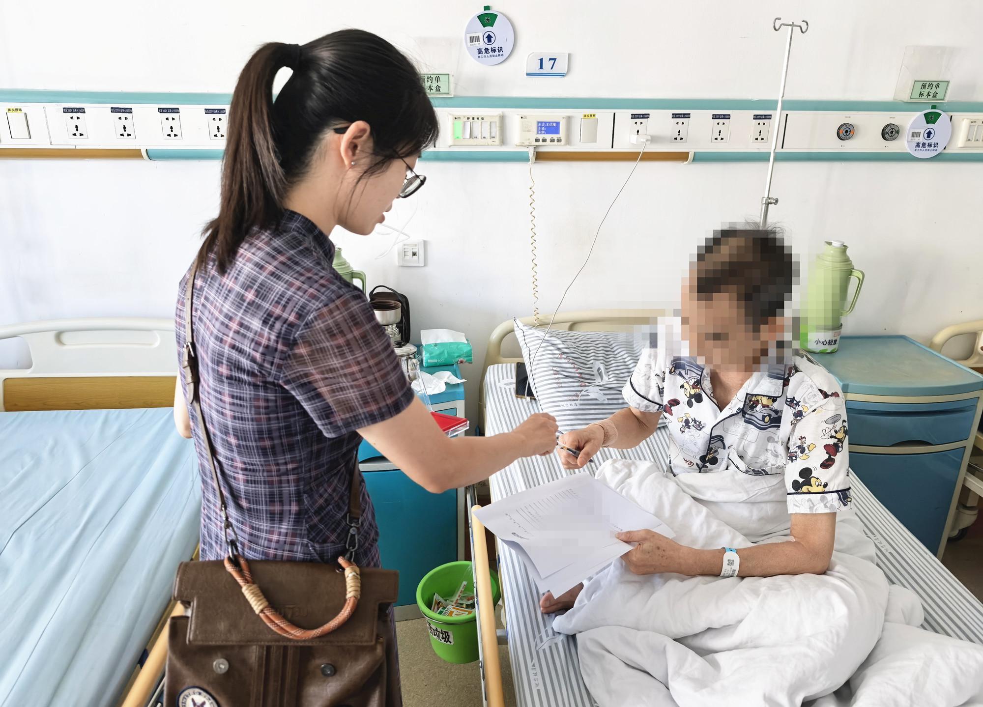 日前,社矫对象郭某因心脏病住院,且需接受心脏瓣膜手术,厦门市思明区司法局中华司法所工作人员前往医院,关切询问郭某病情、送上慰问关怀,又清晰明确其需遵守的矫正义务,以专业与温情兼顾的服务,保障矫正工作有序推进。图为工作人员在病床旁与郭某进行相关文件签署。 |