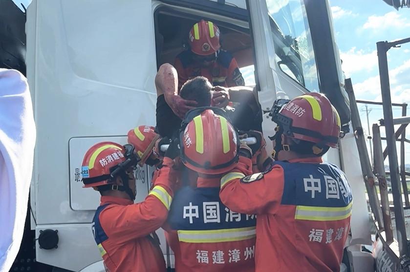 本报讯 近日,漳州市消防救援支队接到群众报警称,漳浦县北江村红绿灯处发生一起交通事故,有人员被困。接警后,市消防救援指挥中心迅速调派古雷港经济开发区消防救援大队新港城站消防救援人员赶往现场施救。 消防救援人员抵达事故现场发现,三车发生碰撞,其中一辆新能源挂车追尾前方小货车,车头受损严重,驾驶室受挤压严重变形,挂车驾驶员被卡在座椅与方向盘之间无法动弹,头部受伤流血,所幸意识仍清醒,情况紧急。 指挥员立即制定救援方案,同步实施现场警戒,防止发生二次伤害。救援过程中,消防员利用液压扩张器与液压顶杆对挂车驾驶室车门进行扩张。同时,一名消防员从副驾驶侧进入车内,不断安抚被困驾驶员情绪。随着作业空间逐步扩大,消防员小心翼翼地将驾驶员从车内抬出,转移至安全区域,由现场医护人员接手进行救治。 |