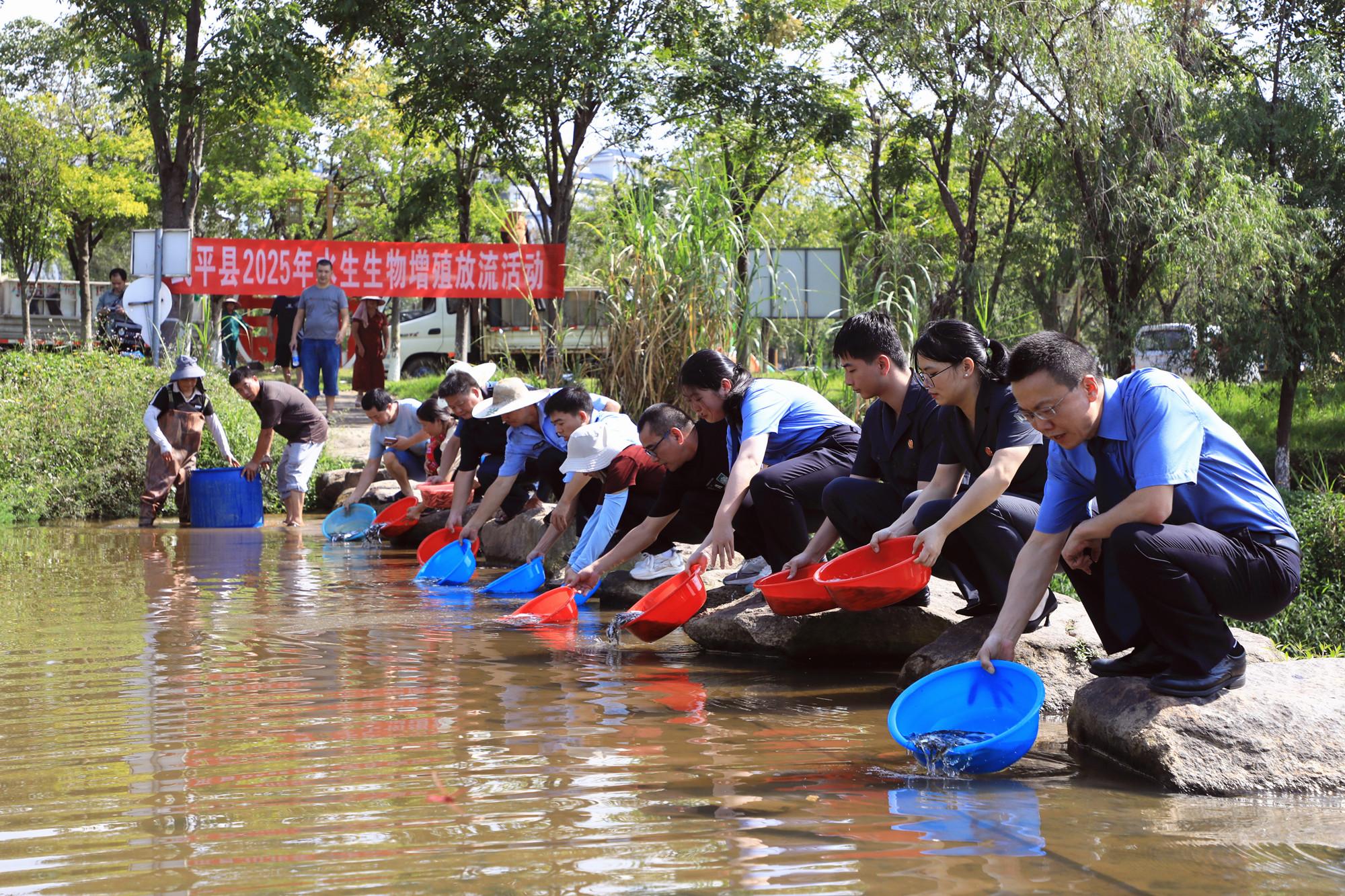 近日,武平县人民检察院联合县农业农村局、水利局、法院等多个单位开展水生生物增殖放流活动,在全县多个水域投放优质鱼苗38.7万尾,并同步开展水生生态保护普法宣传。图为工作人员增殖放流现场。 |