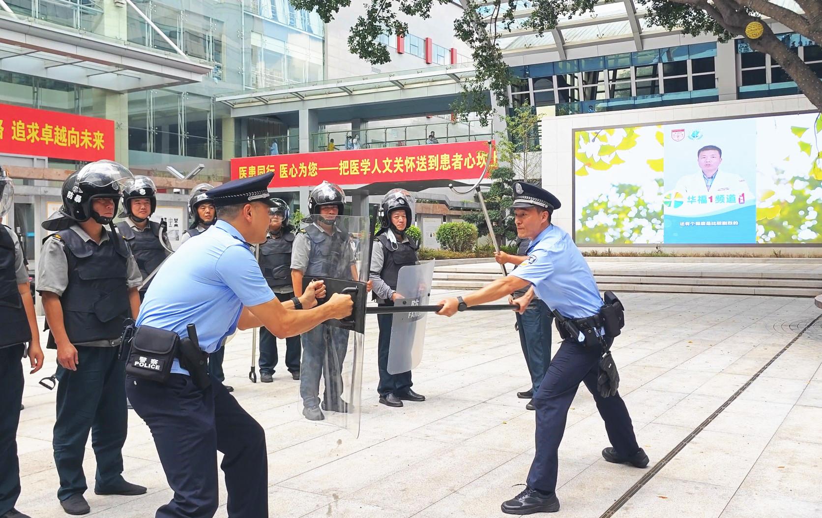 近日,福州市公安局上海派出所联合台江分局巡特警反恐大队,深入辖区三甲医院开展反恐防暴实战化演练和应急处置培训活动。图为演练教学现场。 |