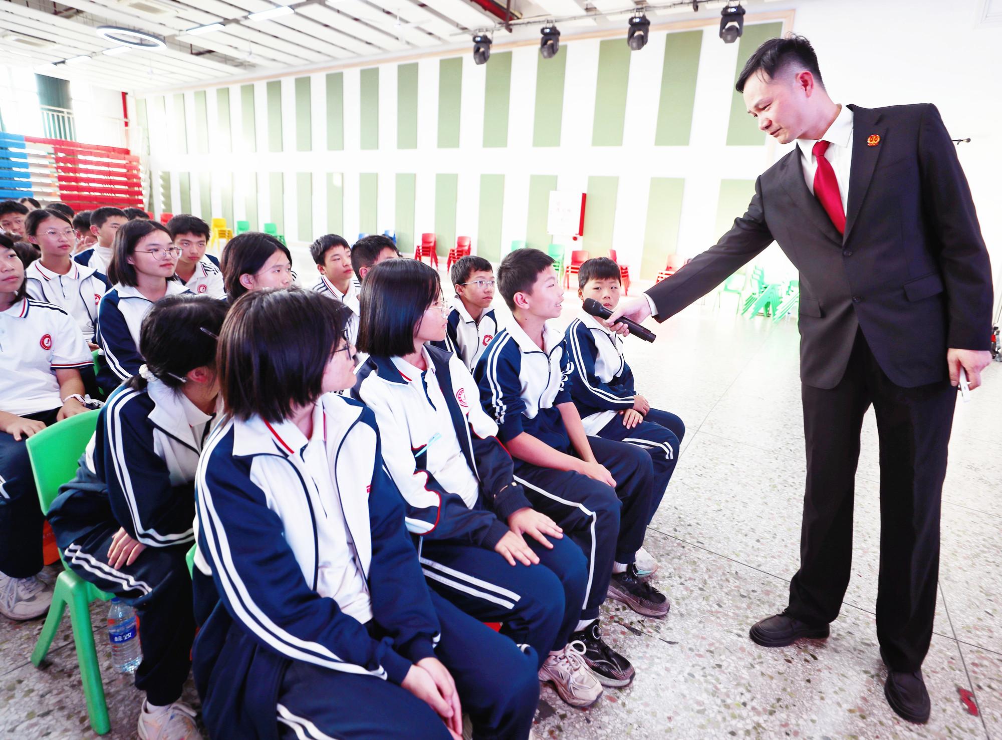 近日,龙岩市新罗区关工委与新罗区人民法院在区中小学生社会实践教育基地联合举办“与法同行·护航成长”青少年普法教育专题讲座。图为法官与雁石中学学生开展互动问答。 |