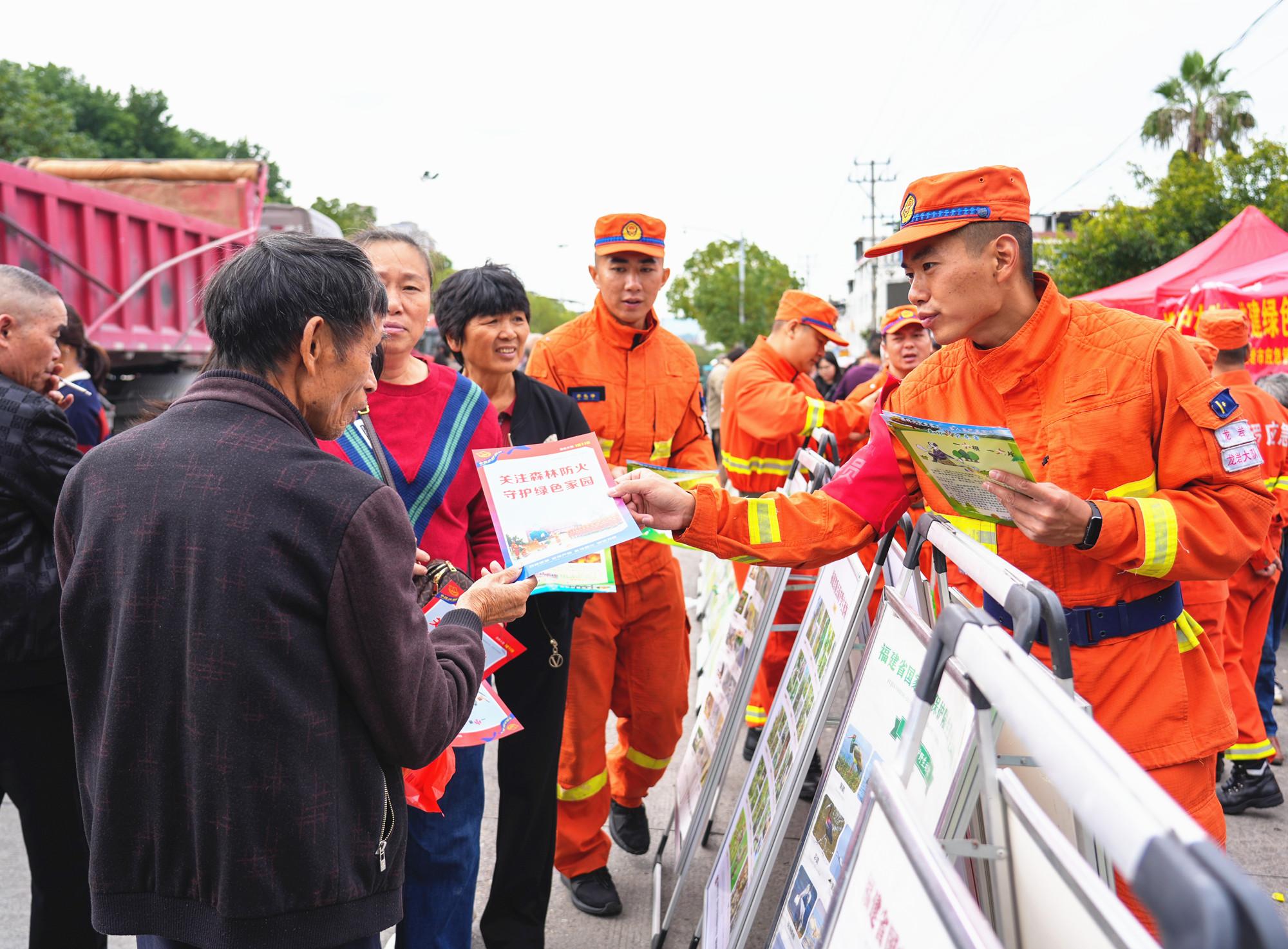近日,龙岩市森林消防支队联合多部门在新罗区适中镇开展秋冬季森林防火宣传活动。图为消防员向群众发放森林防火宣传资料。 |