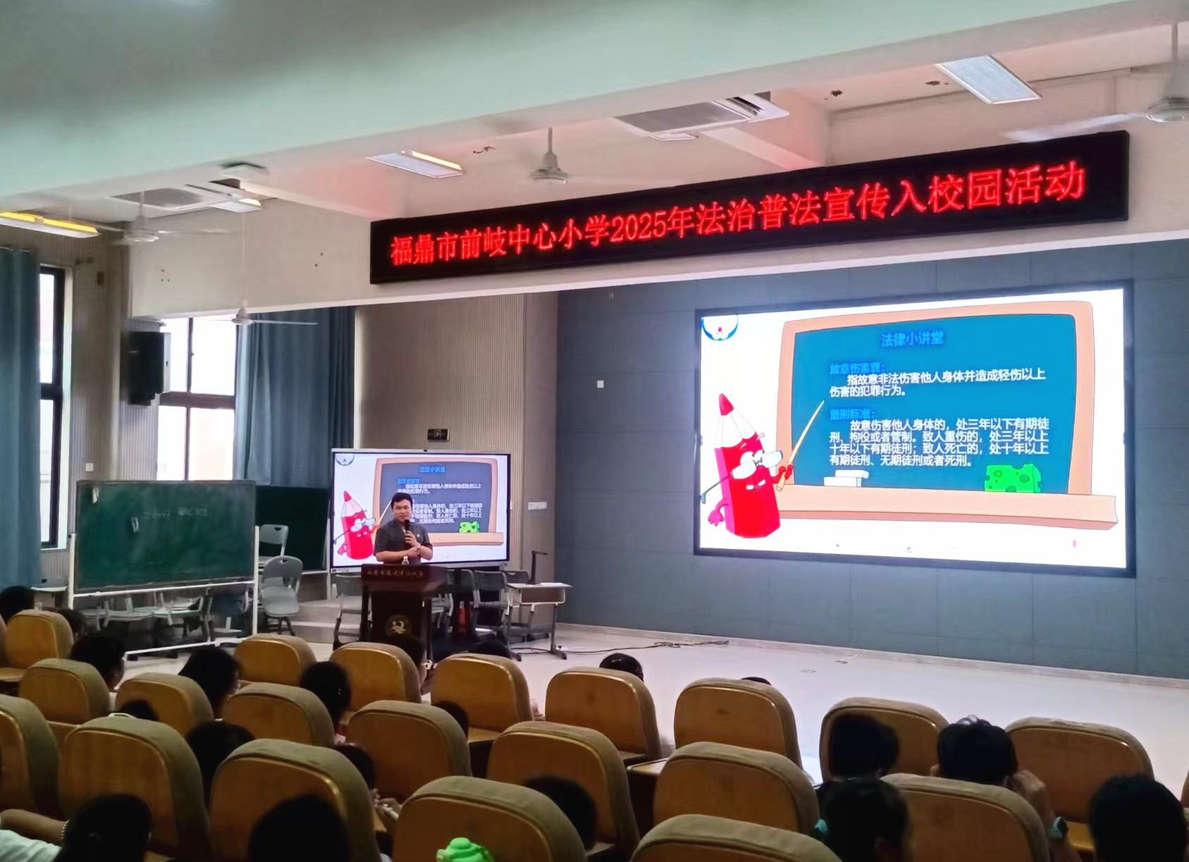 近日,福鼎法院干警前往前岐中心小学开展“送法入校”活动。图为法院干警为同学们上法治教育课。 |