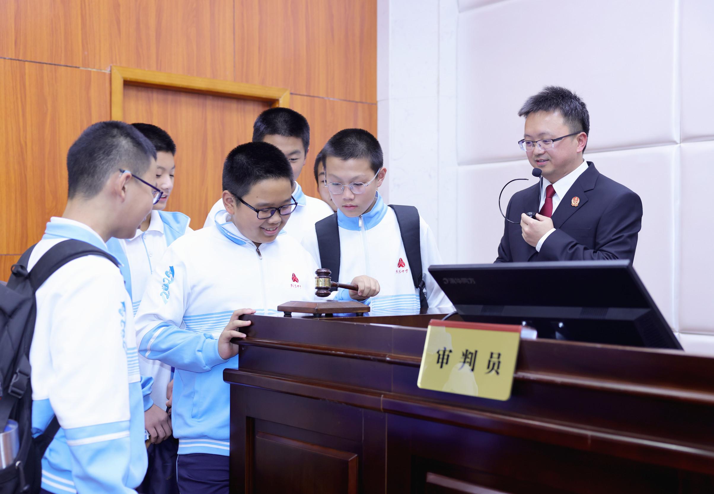 近日,三明市中级人民法院、共青团三明市委员会联合开展以“红领巾法治课堂”为主题的法院开放日活动,邀请三明市列东中学100多名师生走进法院,通过参观科技法庭、观看普法短视频、聆听法官解读校园欺凌典型案例等,让学生沉浸式接受法治的熏陶和教育。图为三明中院干警向学生介绍法槌的使用规定和意义。 |
