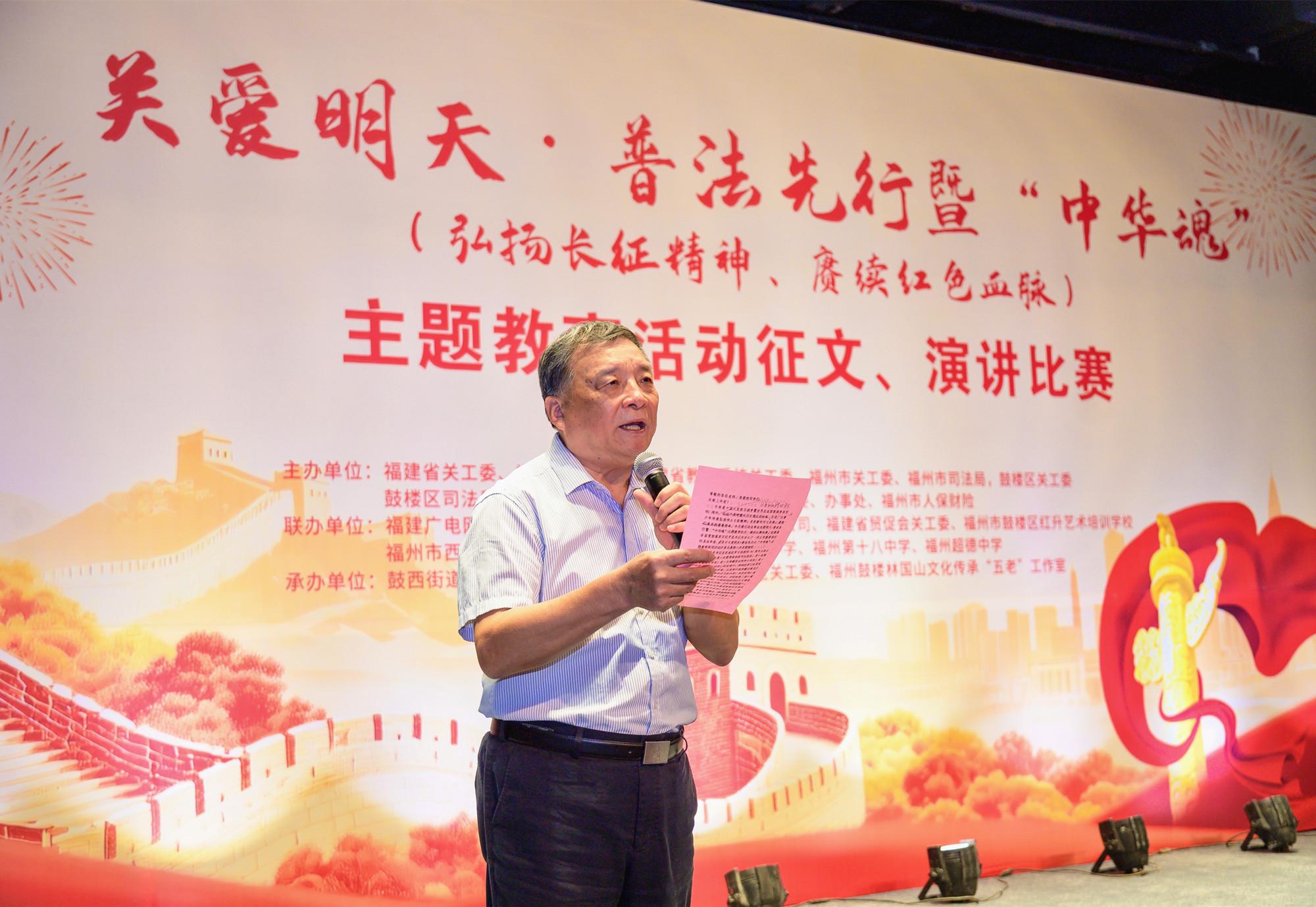 近日,由福建省关工委、福建省司法厅、福建省教育系统关工委、福州市关工委、福州市司法局、鼓楼区关工委、鼓楼区司法局、鼓楼区教育系统关工委等单位承办的关爱明天·普法先行暨“中华魂”(弘扬长征精神 赓续红色血脉)主题教育活动征文、演讲比赛决赛在西湖电影院举办。图为福建省关工委副主任、法治委主任、福建省关爱工作团常务副团长陈勇代表主办方致辞。 |
