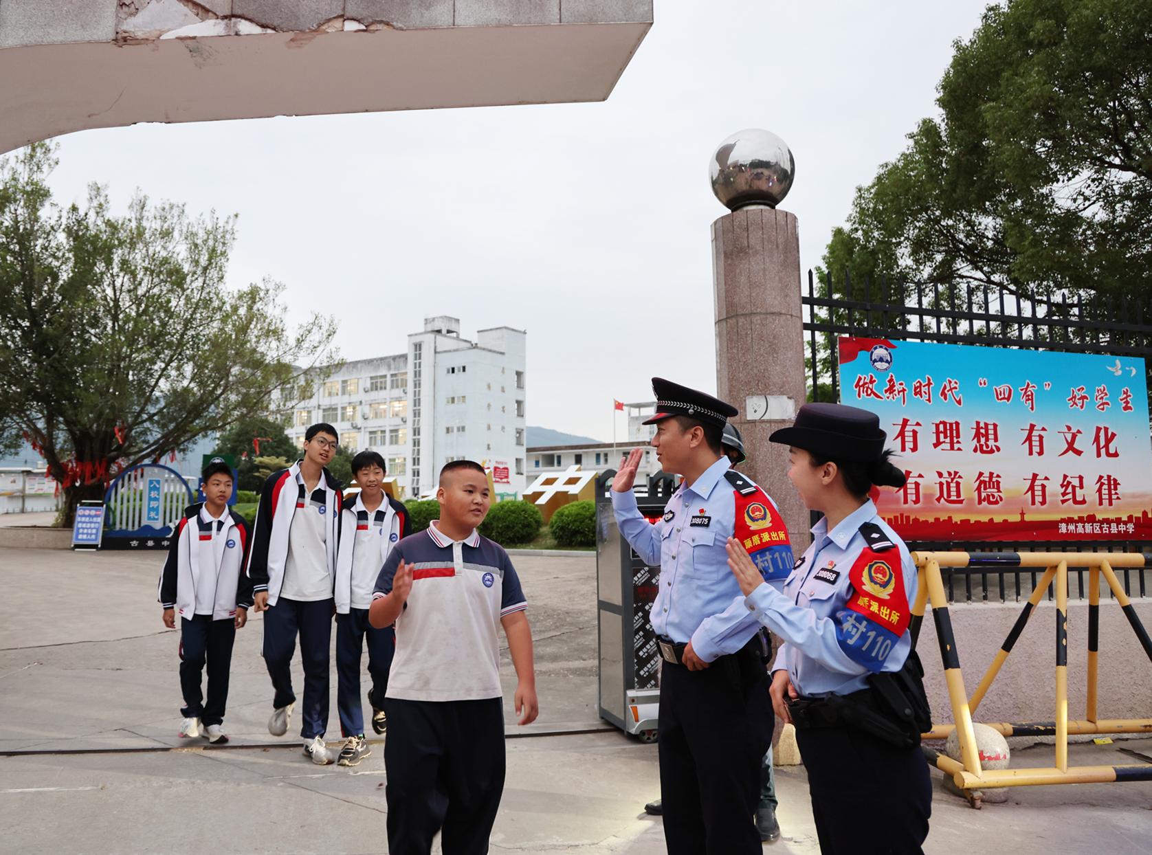 近日,漳州市公安局高新区分局组织警力走进古县中学,与学校保安联合设立“护学岗”,保障学生上学、放学安全。图为民警在校门口执勤。 |