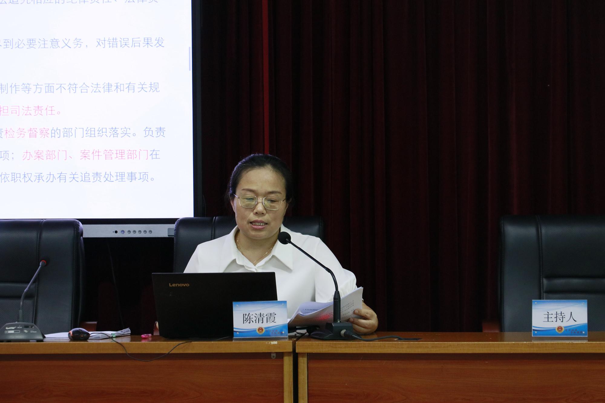 近日,莆田市荔城区检察院举办案件质量评查、司法责任追究专题培训会,进一步提升检察干警办案质效,规范司法行为,强化责任担当。图为莆田市检察院检务督察部副主任陈清霞为干警上培训课。 |