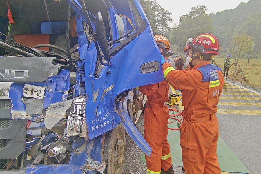本报讯 近日,南平市建阳区发生一起两车相撞事故,有驾驶员被困。消防救援人员经过10分钟的紧急救援,成功将被困人员救出。