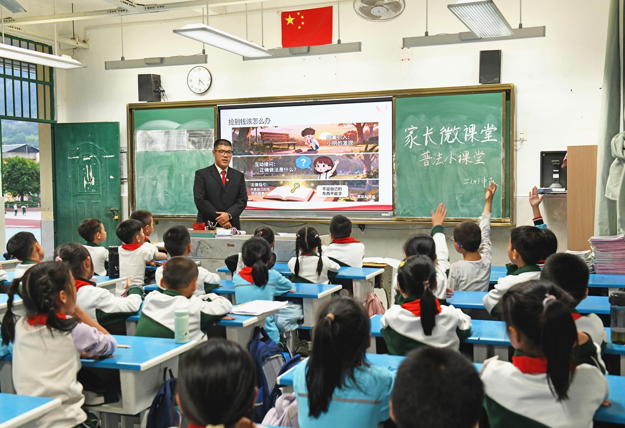 近日,尤溪县人民法院干警走进尤溪县实验小学,开展“法治宣传进课堂”主题活动。活动中,干警结合小学生认知特点,通过趣味案例、互动问答、情景模拟等形式,用通俗生动的语言讲解法律常识,引导学生树立正确的权利义务观念。图为干警与学生们互动交流。 |