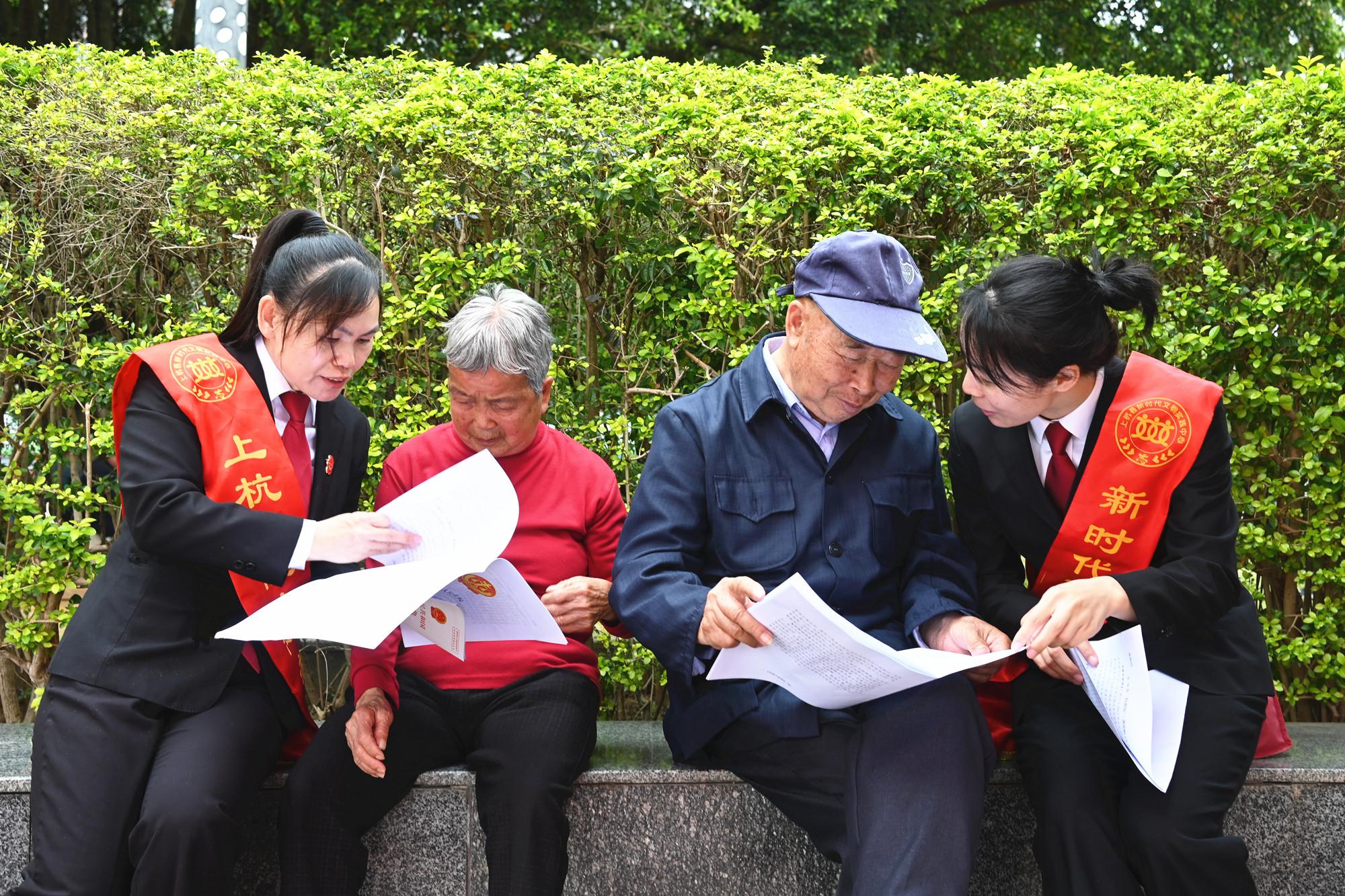 近日,上杭法院干警到辖区公园、街头等地,聚焦热点问题开展普法宣传,进一步增强群众法治意识。图为干警向群众讲解相关法律知识。 |