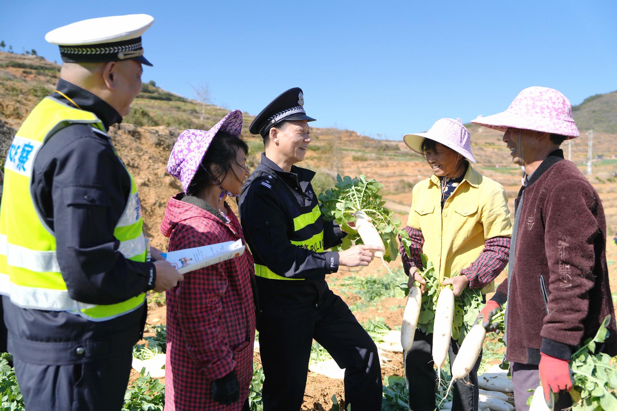 近日,大田县公安局交管大队走进武陵乡雪山萝卜种植基地,开展交通安全宣传活动。图为民警在帮助村民采摘萝卜的同时,向其讲解交通安全法律知识。 |