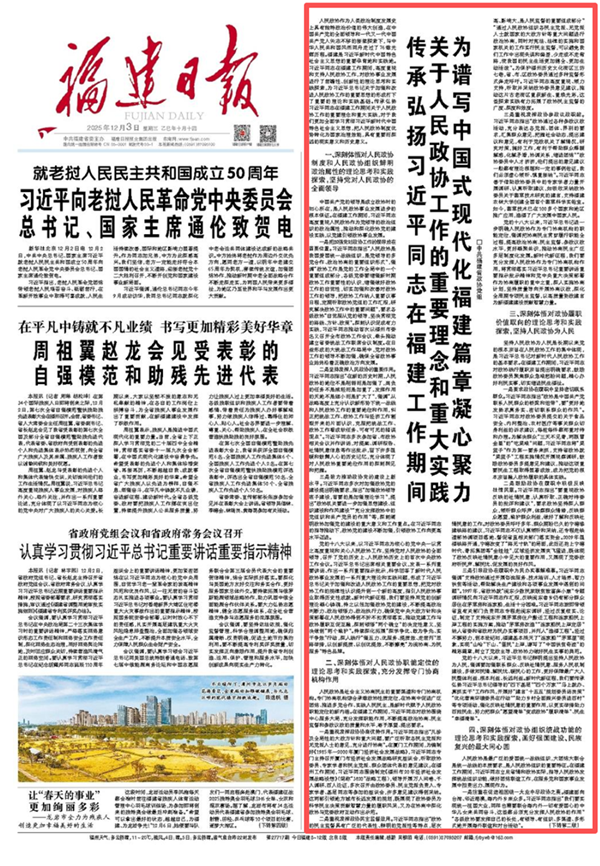 2025年12月3日《福建日报》第01版 人民政协作为人类政治制度发展史上具有独特政治价值的伟大创造,在中国共产党的全面领导和一代又一代中国共产党人矢志不移的接续探索下,与中华人民共和国风雨同舟走过了76载光辉历程。福建是习近平新时代中国特色社会主义思想的重要孕育地和实践地。习近平同志在福建工作期间,高度重视和支持人民政协工作,对政协事业发展进行了前瞻性、创新性的理论思考和实践探索,为习近平总书记关于加强和改进人民政协工作的重要思想的形成打下了重要的理论和实践基础。传承弘扬习近平同志在福建工作期间关于人民政协工作的重要理念和重大实践,对于我们更加全面学习贯彻习近平新时代中国特色社会主义思想,把人民政协制度优势转化为国家治理效能,具有重要而深远的现实意义和历史意义。 一、深刻体悟对人民政协制度和人民政协组织鲜明政治属性的理论思考和实践探索,坚持党对人民政协的全面领导 中国共产党的领导是成立政协时的初心所在,是人民政协事业发展进步的根本保证。在福建工作期间,习近平同志高度重视人民政协作为党领导的政治组织的政治属性,推动和深化政协党的建设实践,以党建引领政协事业发展。 一是把加强党对政协工作的领导放在首要位置。习近平同志指出“人民政协是我国爱国统一战线组织,是党领导的多党合作、政治协商的重要组织形式”,强调“政协工作是党的工作全局中的一个重要组成部分,各级党委要增强新时期政协工作重要性的认识,增强做好政协工作的自觉性,切实加强和改善对政协工作的领导,把政协工作纳入重要议事日程,定期听取政协党组的工作汇报,研究解决政协工作中的重要问题”,要求各级政协“自觉服从党的领导,坚决贯彻党的路线、方针、政策”。深刻认识促成有力实践,习近平同志推动首次以福州市委名义召开全市政协工作会议,牵头推动建立省委统战工作联席会议制度。在日益形成的大统战工作格局中,党对政协工作的领导不断加强,确保全省政协事业始终沿着正确政治方向发展。 二是坚持发挥人民政协的重要作用。习近平同志指出“在新的历史时期,人民政协的地位不是削弱而是加强了,肩负的任务不是减轻而是加重了,发挥作用的天地不是缩小而是扩大了”,强调“从战略高度上充分认识新形势下统一战线和人民政协工作的重要地位和作用,纠正把统战工作、政协工作与经济工作割裂开来的片面认识,克服把统战工作、政协工作看成软任务、可有可无的错误观点”。习近平同志多次参加省、市政协相关会议并作讲话,对提案、调研报告、社情民意信息等作出批示,留下许多温暖和鼓舞人心的历史记忆,充分体现了对人民政协重要地位作用的深刻洞见和把握。 三是致力推动政协党的建设上新水平。习近平同志多次对加强政协党的建设提出明确要求,指出“加强政协领导班子建设,首要的是加强理论学习”,提出“政协机关要进一步加强思想建设、组织建设和作风建设”“充分发挥政协中的党组织和共产党员的作用”等,深刻阐明政协加强党的建设的重大意义和工作重点。在习近平同志的指导推动下,政协党的建设不断加强,引领政协工作向更高水平迈进。 党的十八大以来,以习近平同志为核心的党中央一以贯之高度重视和关心人民政协工作,坚持党对人民政协的全面领导,召开了党的历史上、人民政协历史上的首次中央政协工作会议。习近平总书记出席相关重要会议,发表一系列重要讲话、作出一系列重要指示批示,科学回答了新时代人民政协事业发展的一系列重大理论和实践问题,形成了习近平总书记关于加强和改进人民政协工作的重要思想,把党对政协工作的规律性认识提升到一个新的高度,指引人民政协事业取得历史性成就。新时代新征程,我们要坚持用党的创新理论凝心铸魂,持之以恒加强政协党的建设,不断提高政治判断力、政治领悟力、政治执行力,确保党中央大政方针和决策部署在人民政协得到不折不扣贯彻落实,推动党建工作与政协履职互促互融,深刻领悟“两个确立”的决定性意义,坚决做到“两个维护”。持续深化拓展“深学争优、敢为争先、实干争效”行动,深入践行“强五力、优服务、提质效、走前列”思路举措,以创新提质、以创优提效,不断擦亮“为闽协商、为民服务”特色品牌。 二、深刻体悟对人民政协职能定位的理论思考和实践探索,充分发挥专门协商机构作用 人民政协是社会主义协商民主的重要渠道和专门协商机构。专门协商机构综合承载政协性质定位,在协商中促进广泛团结、推进多党合作、实践人民民主,是新时代赋予人民政协职能定位的新内涵。在福建工作期间,习近平同志对政协围绕中心服务大局,充分发挥职能作用,不断提高政治协商、民主监督和参政议政的质量和水平,寄予厚望、提出要求。 一是重视发挥政协协商优势作用。习近平同志指出“凡涉及全局性的大政方针和重大问题,要广泛听取各民主党派和无党派人士的意见,充分进行协商”。在厦门工作期间,为编制好《1985年—2000年厦门经济社会发展战略》,习近平同志专门主持召开厦门市经济社会发展战略研究座谈会,听取政协委员、专家学者和民主党派、群众团体代表的意见建议;在福州工作期间,习近平同志围绕制定《福州市20年