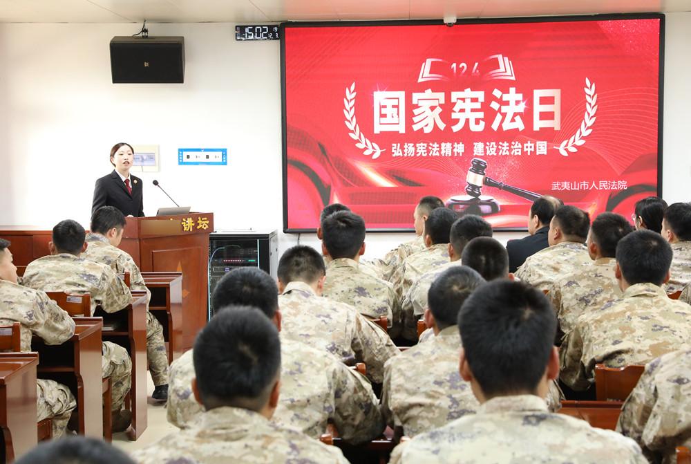 ▲ 武夷山市人民法院干警到武夷山某空军部队,结合与官兵权益密切相关的法律条款,为官兵解读买卖合同、遗产继承、交通事故处理等法律问题。