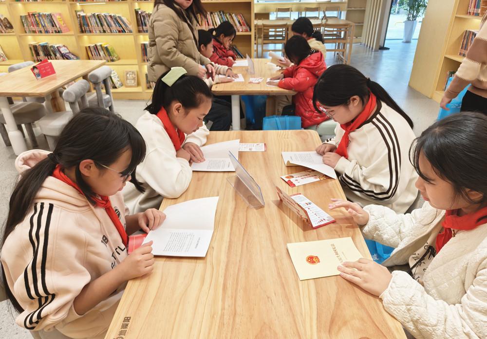 ▲ 南平市建阳区司法局组织辖区中小学生在崇阳公益书吧进行读书活动,学生品读宪法相关学习资料,理解宪法赋予公民的权利与义务。