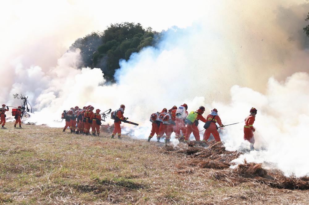近日,厦门举行“绿盾-2025”森林防火灭火综合演练。演练模拟园林植物园因游客乱丢烟头引发森林火灾,共调集21支队伍近300人、各类车辆66台、装备超700件套参与,是一次多力量、多科目的综合性实战检验。图为在无人机分队投放干粉灭火弹助力下,省森林消防总队厦门驻防分队消防员采取打清结合的方式灭火。 |