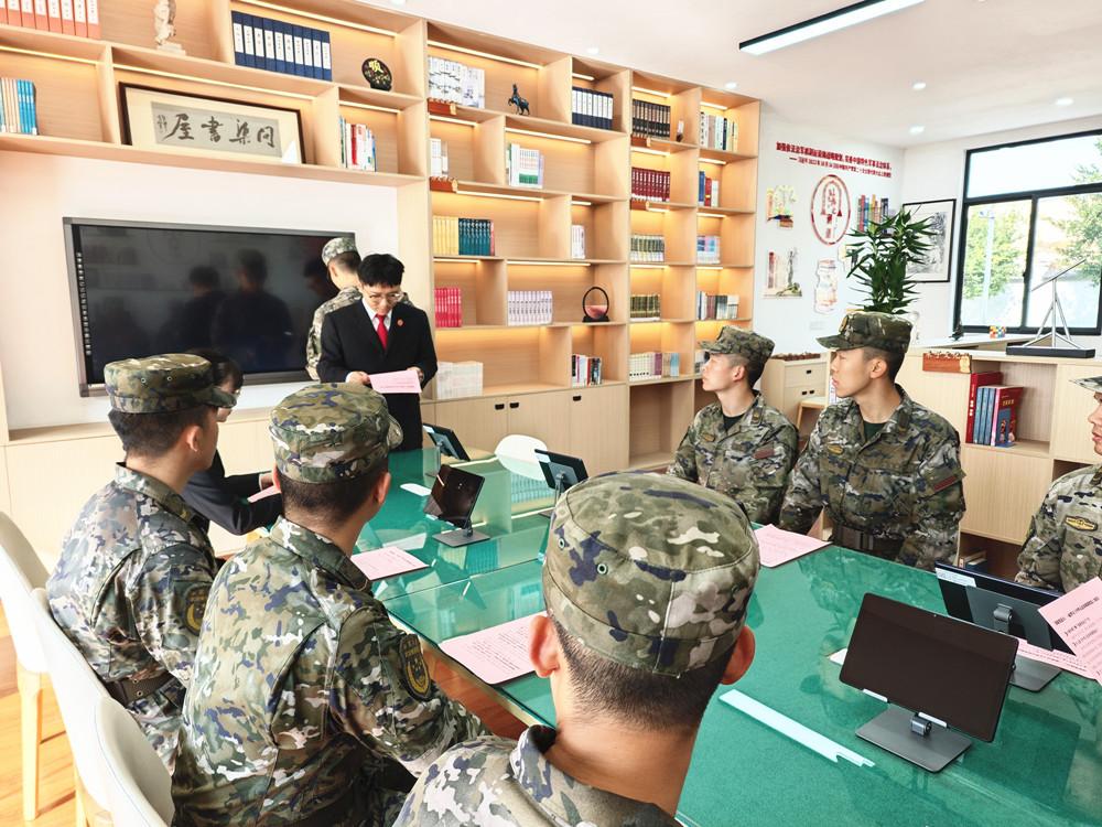 近日,尤溪县人民法院民庭干警前往武警三明支队尤溪中队开展普法宣传活动。图为法院干警结合典型案例,向武警官兵讲解民法典、国防法、兵役法等法律法规知识。 |