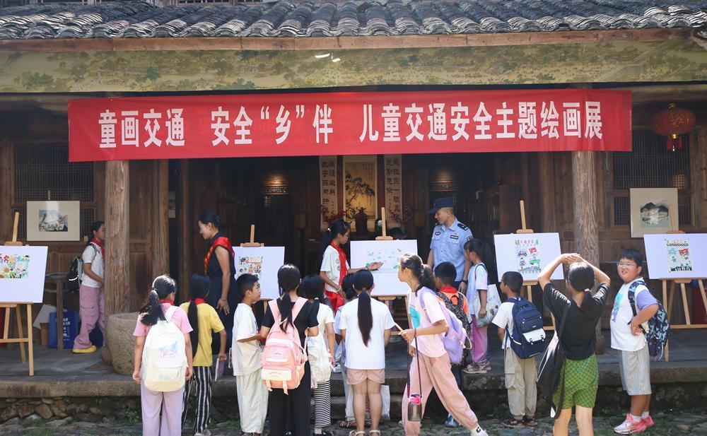 8月26日,在“萤火虫计划”斜滩站,宣讲队向斜滩志愿消防队员发放“志愿者三件套”。 在犀溪镇西浦村的青石板巷,“姐妹讲解团”的巾帼志愿者身着红马甲,用亲切的本地话向村民温情劝导。这支由全职宝妈、代课老师等乡村女性组成的巾帼队伍,接过“志愿者宣传N件套”,成为村里首支交通安全志愿宣讲队。经“萤火虫计划”系统培训后,她们扛起西浦村的日常交通宣讲工作,让安全知识随着乡音传入千家万户。 9月4日,“萤火虫计划“犀溪站在西浦乡村美术馆举办儿童交通安全主题画展。 寿宁农村地区地域广阔、人口分散、交通复杂,传统安全宣传常面临“覆盖难、渗透浅、持续短”的现实困境。为破解这一难题,今年8月,寿宁县公安局立足县域实际,锚定“全民参与”核心目标,以“萤火虫计划”为抓手,构建“县——乡——村”三级联动体系,推动安全宣传从公安“单打独斗”向社会“全民参与”转变。 寿宁县公安局坚持高位统筹,将“萤火虫计划”纳入年度法治宣传重点工作,成立由分管局领导牵头的专项工作组。“我们结合辖区常住人口特点和警情发生规律,明确‘每周一乡(镇)’的推进节奏,落实‘一乡(镇)一策’,针对不同乡镇的人口结构、民俗特点和产业特色,精准设计宣传方案,确保宣传内容贴合乡镇实际需求。”该局女子骑行中队党支部书记徐晓宇介绍。在资源整合方面,该局打破警种壁垒与部门界限,组建由交警、刑侦、治安、出入境、网安等多部门13名业务骨干组成的“萤火虫宣讲团”,形成专业互补、协同作战的工作格局。同时,积极联动交通、教育、宣传、文旅、卫健等单位,整合卫生院、农技站、信用社等资源,将交通安全宣传与健康体检、农技咨询、金融反诈等服务有机结合,实现“一次活动、多重服务”。