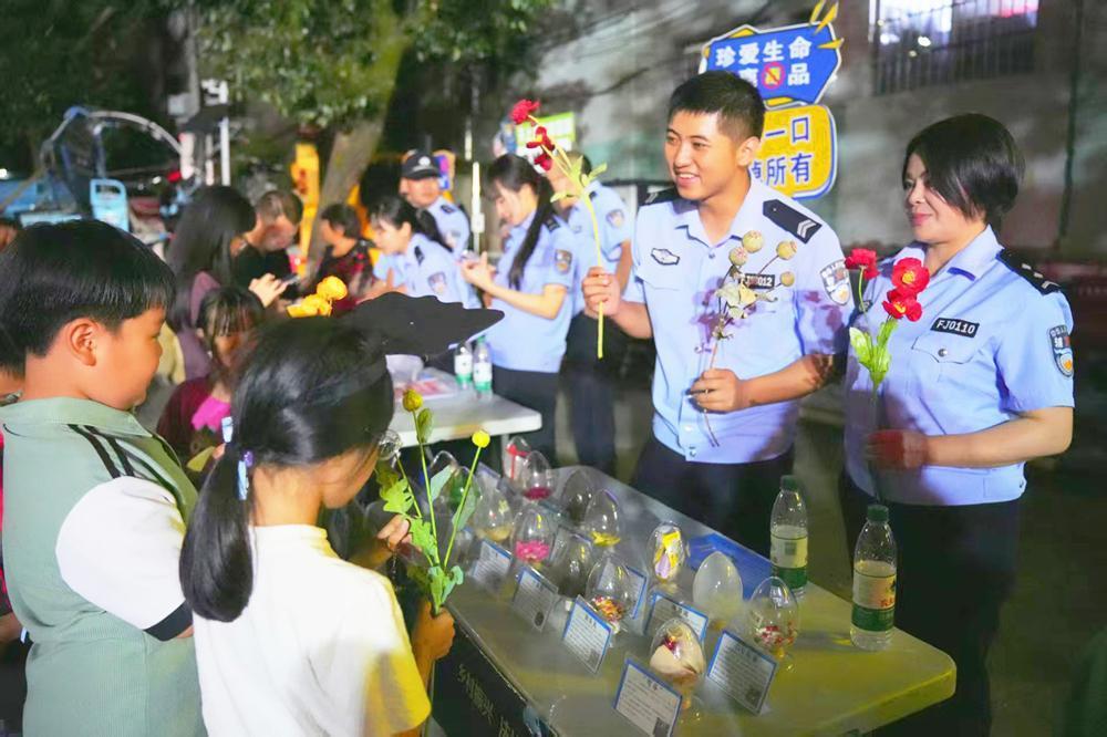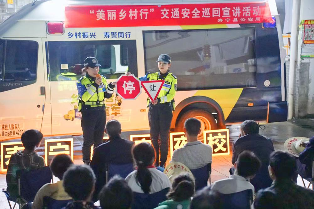 10月16日,在“萤火虫计划”清源站,民警与群众在趣味普法互动区互动。 “‘萤火虫计划’开展以来,摒弃了传统宣传的说教模式,通过深挖寿宁本土文化基因,打造贴合乡村实际的特色宣传载体,推动农村交通安全宣传从‘千村一面’的同质化转向‘一村一品’的特质化。”徐晓宇介绍,“1个主题夜校”作为“萤火虫计划”活动的核心载体,是乡村安全宣传的重要阵地。该局将“夜校课堂”搬进村级活动广场、祠堂、小卖部门口等村民夜间聚集地,每周固定在一个晚上开课,并推出“星空影院”“乘凉夜校小课堂”“板凳议事角”等特色模块。“课堂”现场不仅陈列本地典型事故案例展板、事故车辆残骸实物,还设置互动游戏体验区,通过沉浸式、场景化的布设,让原本枯燥的安全知识变得直观易懂,大幅提升普法宣传的吸引力与感染力。
