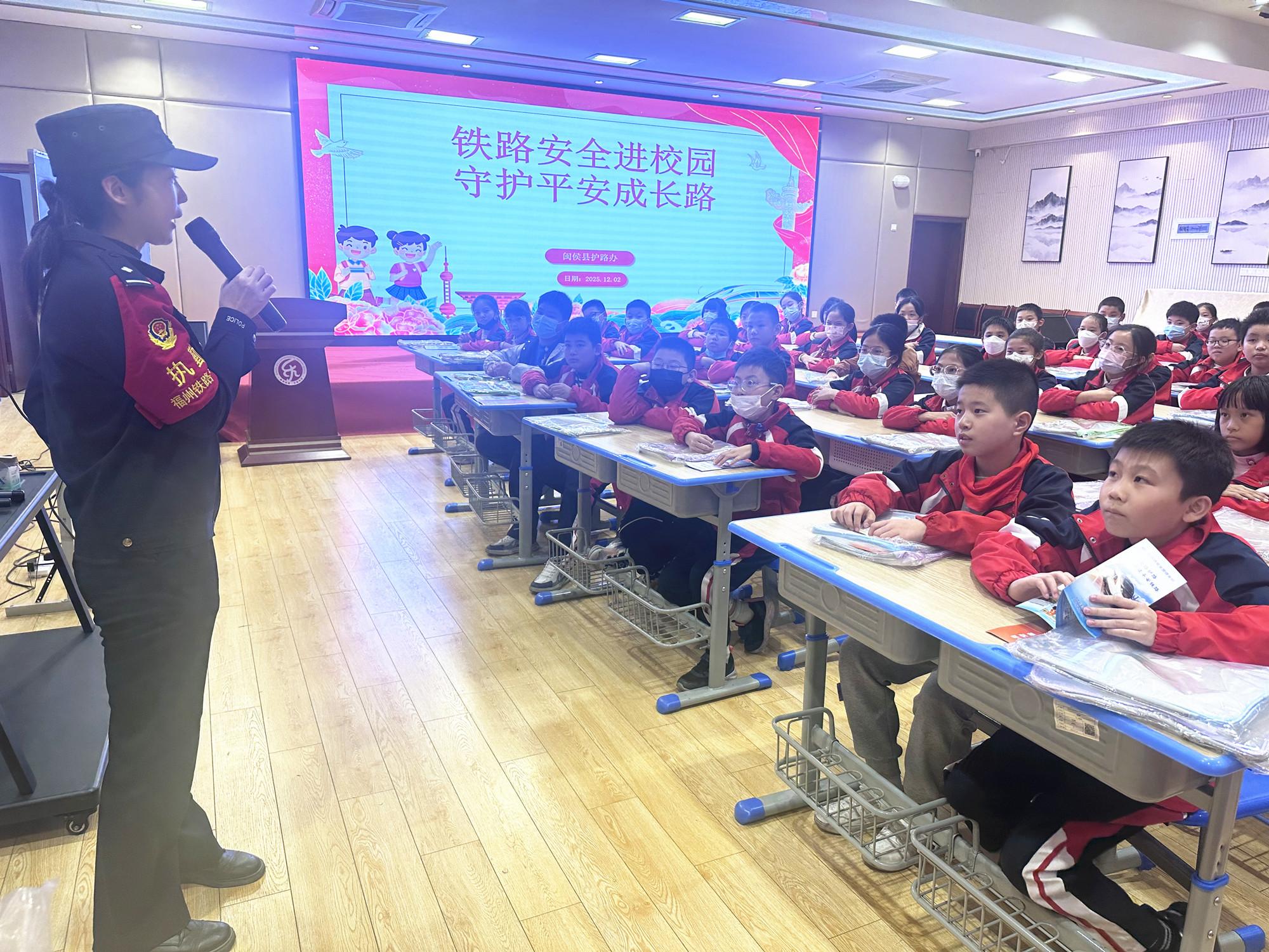 近日,福州铁路公安处闽侯站派出所联合闽侯县委统战部、县教育局、县护路办等单位,到闽侯县第二实验小学开展铁路安全知识进校园活动,切实增强学生爱路护路和铁路安全防护意识。图为民警为学生上安全教育课。 |