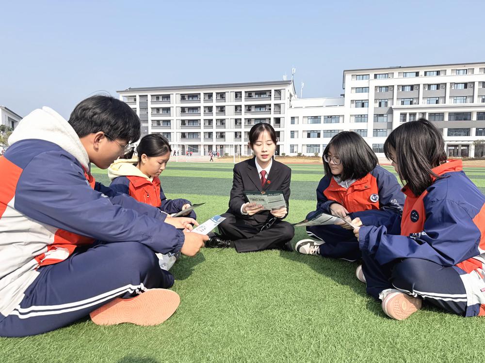 近日,连城县检察院宪法宣传小分队前往连城一中莲北校区开展宣传教育活动,向学生介绍宪法与校园生活的关系,将法治的种子播撒在学生心中。图为小分队队员向学生介绍宪法知识。 |