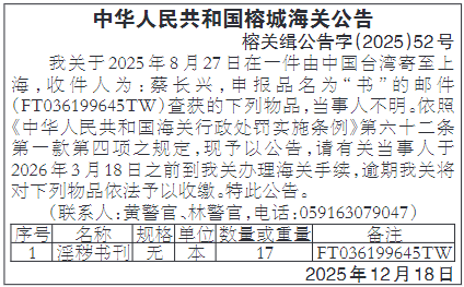 认领公告 2025年9月9日,宁德海警局执法艇在福鼎市沙埕港小白鹭附近海域(27°8′29″N,东经120°24′48″E)查获一艘未涂刷船名船号的钢制船舶。经查:该船船长约17米,船宽约5米,船载冻品约8吨。现依法予以公告,请该船舶及冻品所有人自公告之日起六个月内持相关合法、齐全手续证明到我单位认领并说明情况,逾期未认领的,将依法予以处置。(联系电话:05937581999,联系地址:宁德市福鼎市沙埕镇岙口村旧城1号) 宁德海警局福鼎第一工作站 2025年12月18日 公告 天怡(福建)现代农业发展有限公司:我局于2022年8月25日作出行政处罚决定(闽莆环罚〔2022〕122号),决定对你单位处人民币23.333万元(人民币贰拾叁万叁仟叁佰叁拾元整)罚款。你单位于2022年8月26日收到后,未履行该行政决定。因无法与你单位取得有效联系,现依法向你单位公告送达催告书,此公告期为三十日,公告期满即视为送达。依据《中华人民共和国行政强制法》第五十四条的规定,限你单位自收到本催告书之日起十日内,到莆田市工商银行城厢支行缴纳罚款人民币23.333万元(人民币贰拾叁万叁仟叁佰叁拾元整),(户名:莆田市城厢生态环境局,账号:1405010109022423827)。 若对我局作出的行政处罚决定催告不服,你单位有权进行陈述、申辩。无正当理由逾期仍不履行行政决定的,依据《中华人民共和国行政强制法》第五十三条的规定,我局将依法申请人民法院强制执行。 联系人:徐志明,联系电话:0594-2521081 莆田市生态环境局 2025年12月18日 遗失声明 尤溪县中仙商会遗失尤溪县民政局2011年11月16日核发的社会团体法人登记证书副本一本,证号:尤社证字第201102号,有效期限:凭年检,声明作废。 尤溪县中仙商会 2025年12月18日 遗失声明 永安市恒健物流运输有限公司不慎遗失车号为闽GNS189(蓝色)的中华人民共和国道路运输证一本,证号:闽交运管明字350481300265号,现声明作废。 永安市恒健物流运输有限公司 2025年12月18日 清算公告 南平市建阳区将口镇回潭村阳阳幼儿园经理事会会议决议注销并清算,现已成立清算组进入清算阶段,请有关债权人于见报之日起45日内向清算组申报债权及办理债权登记手续。 地址:南平市建阳区将口镇回潭村 联系人:沈从英,联系电话:18396557523 南平市建阳区将口镇回潭村阳阳幼儿园 2025年12月18日 遗失声明 福州森瑞精密机械有限公司遗失公章一枚,声明作废。 福州森瑞精密机械有限公司 2025年12月18日 公共配套设施移交公告 福清东方云著小区项目已竣工交付使用,现将公共不予销售部分面积7339.35㎡公示如下:地下一层公共配套1886.63㎡;地上一层公共配套5452.72㎡,其中:居委会246.86㎡及养老服务设施246.82㎡移交给龙山街道办事处;小区文化活动中心245.59㎡及其他配套等6600.08㎡属于全体业主所有,待业委会成立后予以移交。 特此公告。 福清京海房地产开发有限公司 遗失声明 福州勇新网络科技有限公司遗失公章一枚,编码:35012110006563,声明作废。 福州勇新网络科技有限公司 2025年12月18日 遗失声明 建瓯市鑫路达物流有限公司不慎遗失车辆牌号:闽HA9617重型半挂牵引车中华人民共和国道路运输证一份,证号:闽交运管南字350783214102号,现声明作废。 建瓯市鑫路达物流有限公司 2025年12月18日 遗失声明 建瓯市鑫路达物流有限公司不慎遗失车辆牌号:闽HV780挂重型普通半挂车中华人民共和国道路运输证一份,证号:闽交运管南字350783214100号,现声明作废。 建瓯市鑫路达物流有限公司 2025年12月18日 |