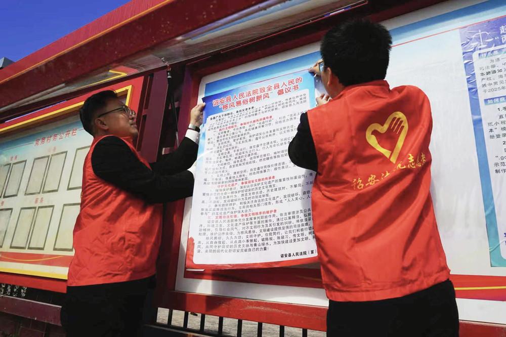 11月21日,诏安法院组织志愿者服务队深入西潭镇沈寨村开展“法育新风尚,文明润人心,移风易俗我先行”主题活动。图为法院志愿者在村委会公告栏张贴《移风易俗树新风倡议书》。 |