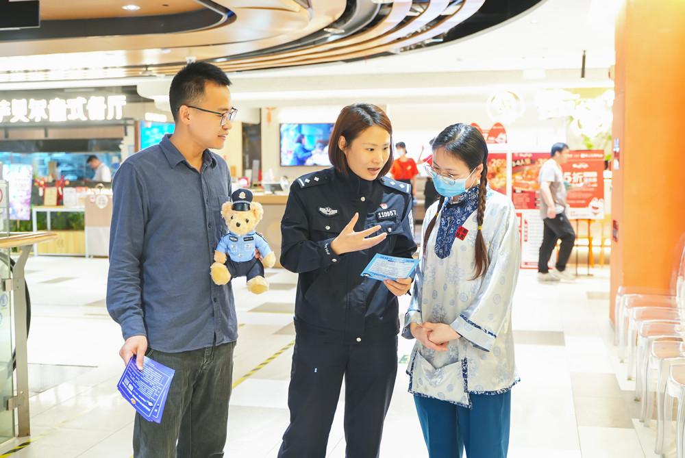 近日,福州市公安局南街派出所民警到东百中心开展反诈宣传。图为民警通过案例讲解、发放资料等方式提醒商户与顾客谨防被骗。 |