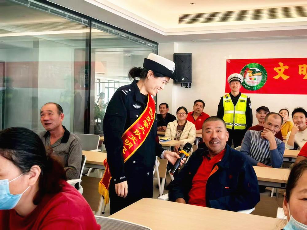 近日,莆田市公安局秀屿分局交警大队民警走进壹路鲜伴(福建)食品有限公司,开展交通安全主题宣传活动,切实提升企业员工交通安全意识。图为民警以互动的形式向企业员工讲解交通安全知识。 |