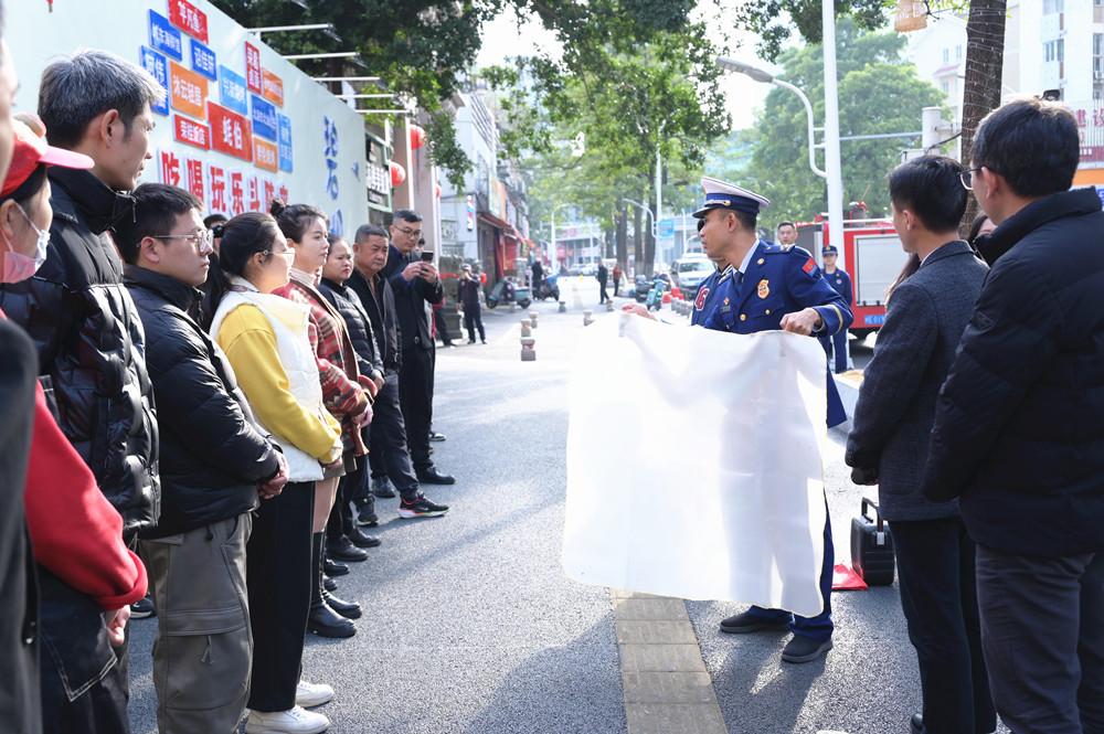 日前,漳州市龙文区消防救援大队联合碧湖街道,在土白社区荣桂路美食街举办小型餐饮场所消防安全管理现场示范教学培训。图为防火监督员向参训人员讲解灭火毯的使用方法和注意事项。 |