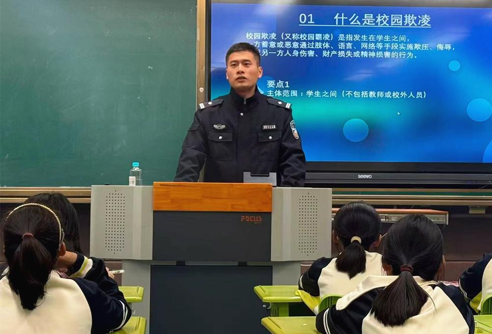 近日,福州市鼓楼区人民法院法警大队、执行局干警前往福州杨桥中学,给学生上了一堂“拒绝校园欺凌 争做阳光少年”专题法治教育课。图为法警向学生讲解预防校园欺凌相关知识。 |