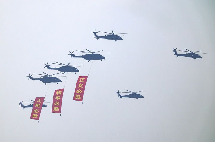 2025年9月3日,纪念中国人民抗日战争暨世界反法西斯战争胜利80周年大会在北京隆重举行。这是空中护旗梯队接受检阅。新华社记者 王婧嫱 摄 纪念大会的宣传报道,与贯穿全年的宣传活动紧密呼应、同频共振。 一年来,宣传思想文化战线紧紧围绕抗战胜利80周年主题主线,大力弘扬伟大抗战精神,引导中华儿女厚植爱国之情、砥砺报国之志。