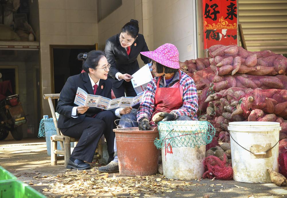 近日,连城法院法官走进四堡镇地瓜干制作工坊开展反诈宣传,筑牢乡村反诈安全防线。图为法官向工人讲解反诈知识。 |
