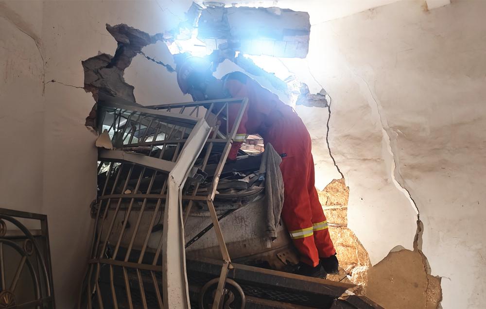 消防救援人员对车体进行破拆。 根据现场情况,指挥员迅速制定救援方案。救援人员从房屋正门进入,利用液压破拆工具组,对束缚驾驶员的关键变形车体结构进行精准扩张、撑顶。随着金属变形的“咔咔”声,挤压驾驶员腿部、腰部的车体框架被缓缓撑开,救援人员随后用剪刀小心剪断束缚其身上的安全带。在初步清理出活动空间后,救援人员全程保护引导,被困驾驶员配合指令调整姿态,小心翼翼地从变形驾驶室中挪动出来。 经过约30分钟的紧张救援,被困驾驶员被成功转移至安全区域,现场等候的120急救人员立即对其进行初步检查,随后送往医院进一步诊治。 |