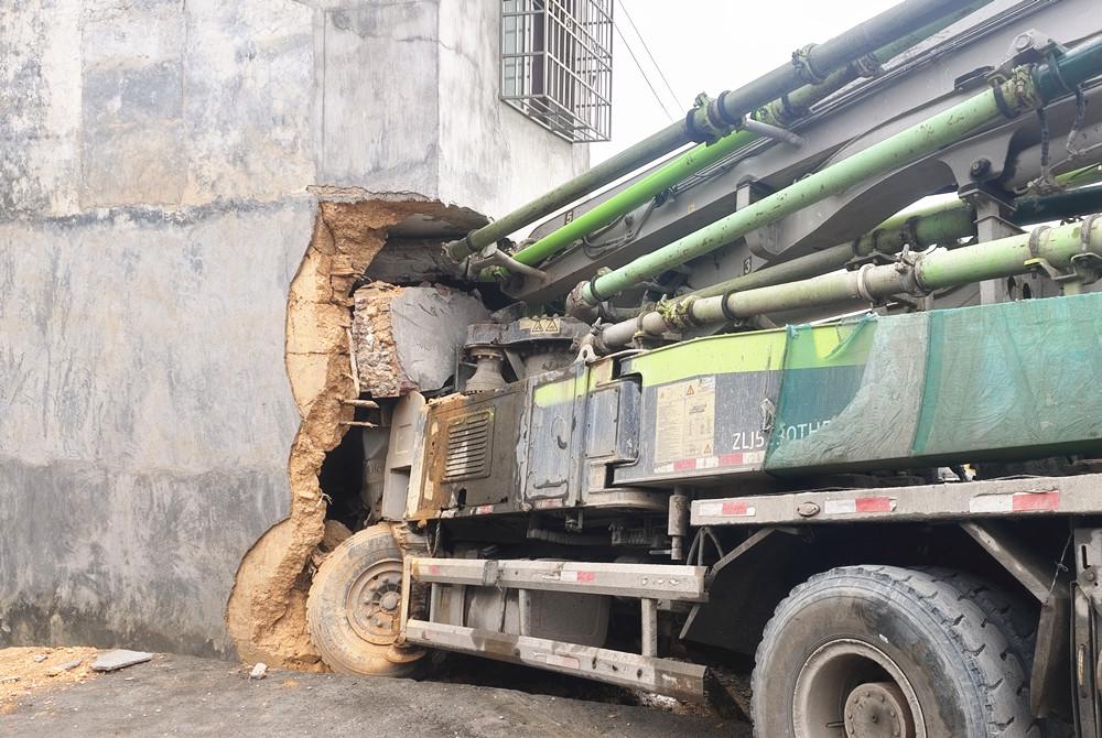 失控的水泥泵车。 消防救援人员抵达现场后发现,泵车车头已完全冲破居民房墙壁,主驾驶位区域卡在房间内,巨大冲击力导致车头严重变形,车身与墙体紧密咬合,驾驶员身体被卡在驾驶座上无法动弹,所幸意识清醒,可正常与救援人员沟通,且事发时房屋内无人,未造成其他人员伤亡。