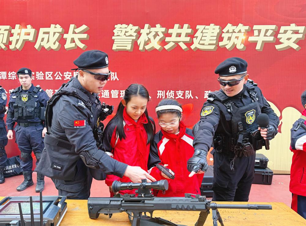 近日,平潭综合实验区公安局海坛支队联合多警种走进平潭城中小学,开展“110宣传进校园”活动,通过装备展示、实操演练、情景教学等形式,为千余名师生带来一堂生动的法治安全教育课。 |