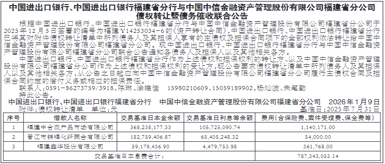 债权转让通知 佛山市顺德区坚迅贸易有限公司、梁子健、卢嘉莲: 一、2016年2月24日,厦门市中级人民法院作出(2015)厦民初字第110号《民事判决书》,判令:(1)佛山市顺德区坚迅贸易有限公司应向我司(即厦门非金属矿进出口有限公司)支付编号为XMFKZD13005《代理采购协议书》项下的货款本金179,508.09元、代理费240,002.40元及违约金(违约金计算至2014年10月31日为653,000.59元,此后以尚欠的货款本金179,508.09元、代理费240,002.40元为基数,按日万分之五计算至判决确定还款之日止),其余杂费(计算至2014年10月31日为35,664.84元,此后以35,664.84元为基础,从2014年11月1日起计算至判决确定还款之日止,按月利率0.8%计);(2)佛山市顺德区坚迅贸易有限公司应向我司支付编号为XMFKZD13018《代理采购协议书》项下货款本金8,002,640元、代理费160,052.80元及违约金(违约金计算至2014年10月31日止为1,501,935.48元,此后以尚欠货款本金8,002,640元、代理费160,052.80元为基数,按月利率3%的标准计算至判决确定还款之日止)、保全费5000元;(3)佛山市顺德区聚福山庄饮食有限公司、梁子健、范彦文、卢远森对前述全部债务承担连带清偿责任;(4)卢嘉莲、龙官平对前述编号为XMFKZD13018《代理采购协议书》项下应付货款本金、代理费、违约金、保全费承担连带清偿责任。 二、上述判决生效后,我司与佛山市顺德区聚福山庄饮食有限公司(下称聚福公司)、卢远森在执行程序中签订了《执行和解协议》。聚福公司、卢远森依协议向我司清偿了货款本金8,182,148.09元,我司依约免除了聚福公司、卢远森在(2015)厦民初字第110号民事判决书项下的其他债务的连带清偿责任。 三、截至目前,贵方对我司仍负有以下债务尚未清偿: 1、贵方中的佛山市顺德区坚迅贸易有限公司按照(2015)厦民初字第110号《民事判决书》的规定,应向我司支付编号为XMFKZD13005《代理采购协议书》项下的代理费240,002.40元及违约金(违约金计算至2014年10月31日为653,000.59元,此后以尚欠的货款本金179,508.09元、代理费240,002.40元为基数,按日万分之五计算至判决确定还款之日止),其余杂费(计算至2014年10月31日为35,664.84元,此后以35,664.84元为基础,从2014年11月1日起计算至判决确定还款之日止,按月利率0.8%计); 2、贵方中的佛山市顺德区坚迅贸易有限公司按照(2015)厦民初字第110号《民事判决书》规定,应向我司支付编号为XMFKZD13018《代理采购协议书》项下的代理费160,052.80元及违约金(违约金计算至2014年10月31日止为1,501,935.48元,此后以尚欠货款本金8,002,640元、代理费160,052.80元为基数,按月利率3%的标准计算至判决确定还款之日止)、保全费5000元; 3、贵方中的梁子健、范彦文,对于佛山市顺德区坚迅贸易有限公司上述第1项、第2项的全部债务应向我司承担连带清偿责任; 4、贵方中的卢嘉莲、龙官平,对于佛山市顺德区坚迅贸易有限公司上述第2项的债务应向我司承担连带清偿责任; 5、贵方因迟延履行生效判决应加倍支付的迟延履行期间的债务利息等。 四、2025年12月24日,我司已将上述第三条中的债权及相应从权利转让给中国厦门国际经济技术合作有限公司。 现我司特就上述债权转让事实通知贵方。自上述债权转让之日起,由中国厦门国际经济技术合作有限公司对贵方行使债权人的一切权利。 通知人:厦门非金属矿进出口有限公司 2026年1月9日 闽侯县公安局无主涉案物品限期处理的公告 我局祥谦派出所案件办理时,现场查扣一批疑是涉案物品,具体清单见闽侯县人民政府网(https://www.minhou.gov.cn/)/闽侯县公安局关于无主涉案财物的公告。请物品所有人自公告发布之日起6个月内前来祥谦派出所认领。逾期6个月未认领的,以上物品将依法处置后上缴国库。 闽侯县公安局 2026年1月9日 执业证遗失声明 王松佳,2025年12月26日因保管不善,遗失福建省司法厅2024年11月4日颁发的(专职)律师执业证书,执业机构:福建知信衡律师事务所,律师执业证号:13501202411842361,执业证书流水号:11876344,现声明作废。 声明人:王松佳 2026年1月9日 遗失声明 福建省司法警察训练总队民警胡双上不慎遗失《人民警察证》,警号3508019,现声明作废。 声明人:胡双上 2026年1月9日 遗失声明 中国石油天然气股份有限公司福建南平销售分公司平阳加油站不慎遗失福建省建瓯市工商行政管理局2016年7月1日核发的营业执照正、副本各一份(统一社会信用代码:91350783731875011N),现声明作废。 中国石油天然气股份有限公司福建南平销售分公司平阳加油站 2026年1月9日 遗失声明 中国石油天然气股份有限公司福建南平销售分公司安济加油站不慎遗失福建省南平市工商行政管理局2013年7月2日核发的营业执照正、副本各一份(统一社会信用代码:913507007416514847),现声明作废。 中国石油天然气股份有限公司福建南平销售分公司安济加油站 2026年1月9日 遗失声明 中国石油天然气股份有限公司福建南平销售分公司西塘加油站不慎遗失福建省南平市工商行政管理局2016年5月17日核发的营业执照正、副本各一份(统一社会信用代码:91350700751399868B),现声明作废。 中国石油天然气股份有限公司福建南平销售分公司西塘加油站 2026年1月9日 遗失声明 中国石油天然气股份有限公司福建南平水南加油站不慎遗失福建省南平市工商行政管理局2013年7月2日核发的营业执照正、副本各一份(统一社会信用代码:91350700669295410F),现声明作废。 