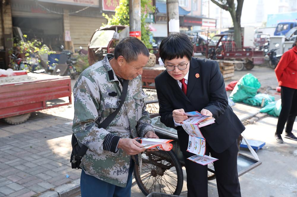 近日,永安市人民法院法官到贡川镇集市开展森林防火集中宣传活动,增强群众防火意识,筑牢森林安全底线。图为法官向群众普及森林法等法律知识。 |