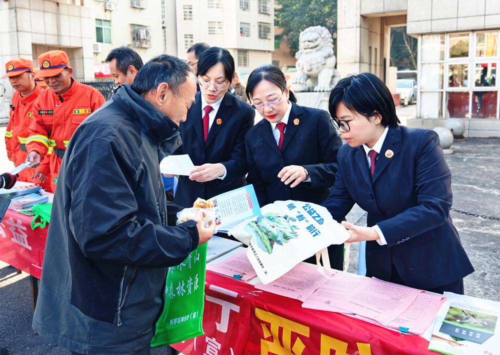近日,龙岩新罗法院联合区自然资源局、检察院等单位,在龙门镇开展森林防灭火集中普法宣传活动,增强群众防火法治意识。图为干警向群众发放宣传资料,普及相关法律知识。 |