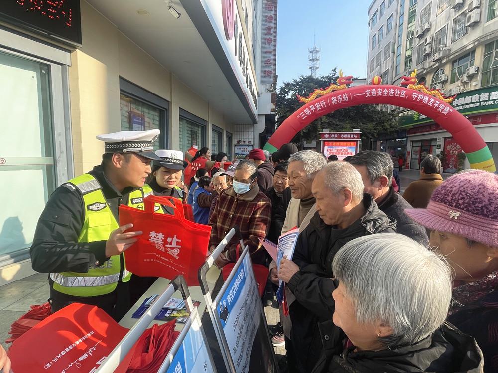 近日,将乐县公安局交通管理大队民警走进将乐县三华大道喷泉广场开展交通安全宣传活动。图为民警向群众讲解交通安全知识。 |