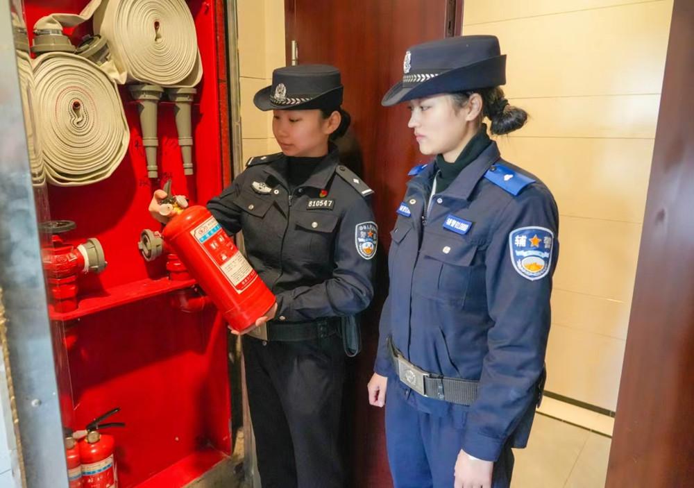 近日,龙岩市公安局新罗分局民警辅警深入东肖镇开展住宅小区安全检查,确保消防器材完好有效。图为民警辅警检查消防栓。 |