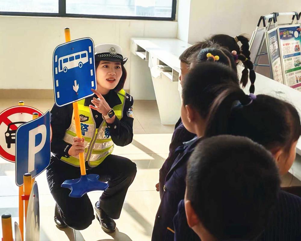 日前,惠安县公安局交通管理大队东桥片区中队联合东桥派出所举办“萌娃进警营”活动。活动中,民警通过趣味问答、卡通展板等形式,向孩子讲解安全过马路、认识交通信号灯、乘车注意事项等交通安全知识。图为民警向孩子介绍交通安全标识。 |