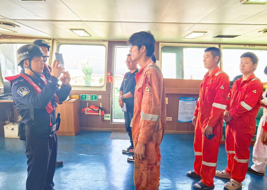 1月17日,中国籍“恒泰红”轮满载数万吨铁矿粉靠泊漳州招银港区。漳州边检站协调联检部门推行联合查验“一站式”服务,实现船舶“抵港零等待,靠泊即作业”。图为边检民警与船长沟通船舶所载货物和航行等情况。 |