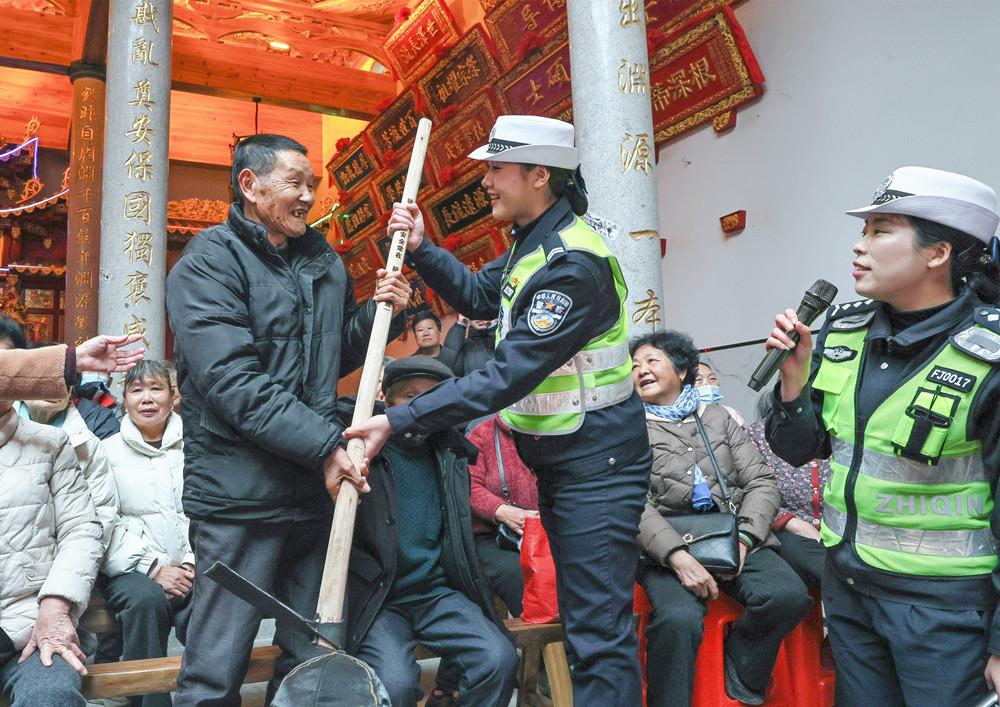 1月21日,福安市公安局交管大队联合市道安办、湾坞镇党委和政府、湾坞派出所到湾坞镇半岭村古祠开展“平安有戏”安全宣教活动。图为在交通安全知识互动问答中,民警为答题群众送上印有安全标语的锄头。 |